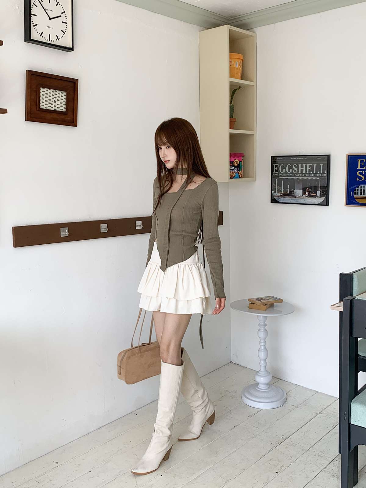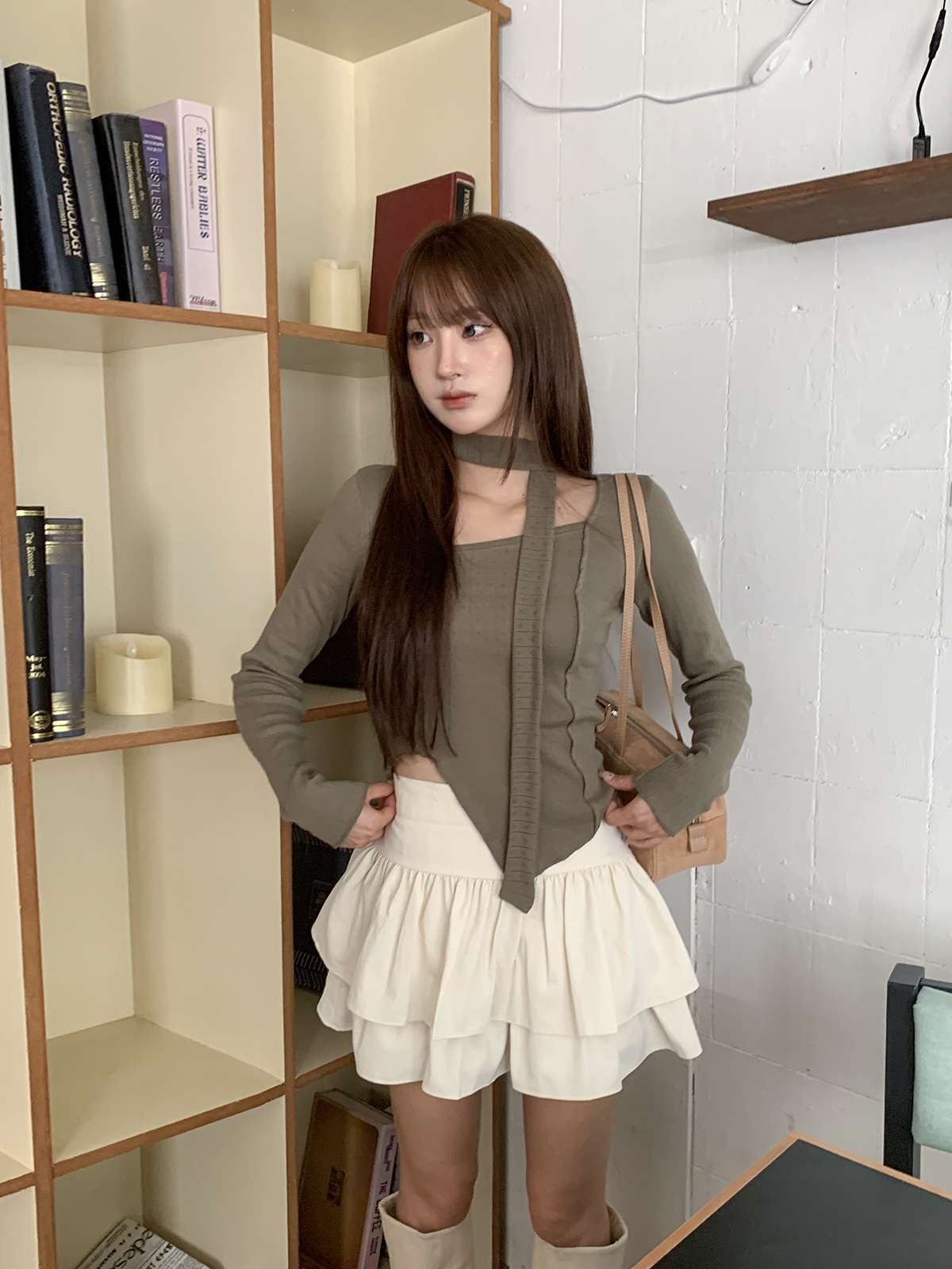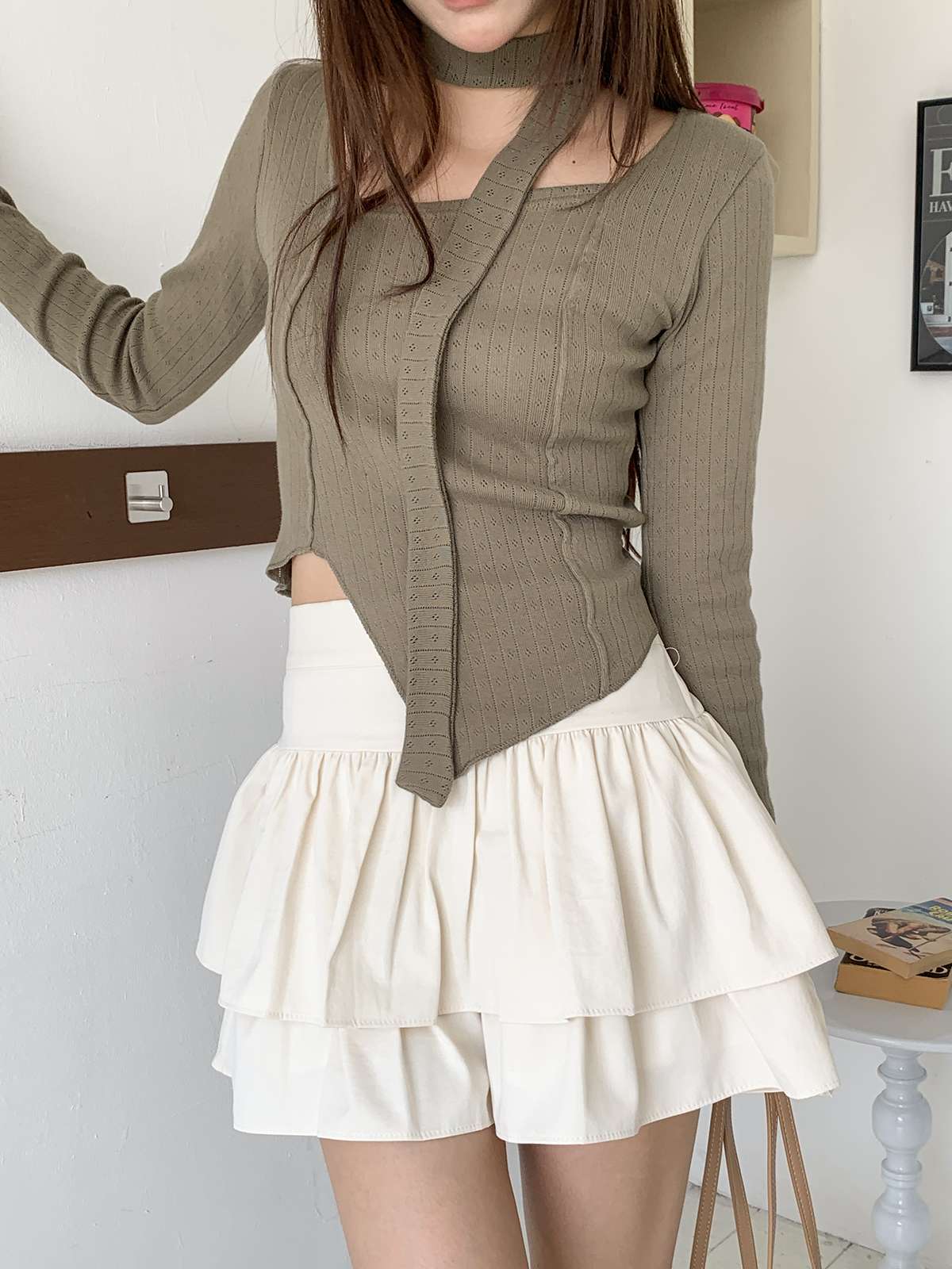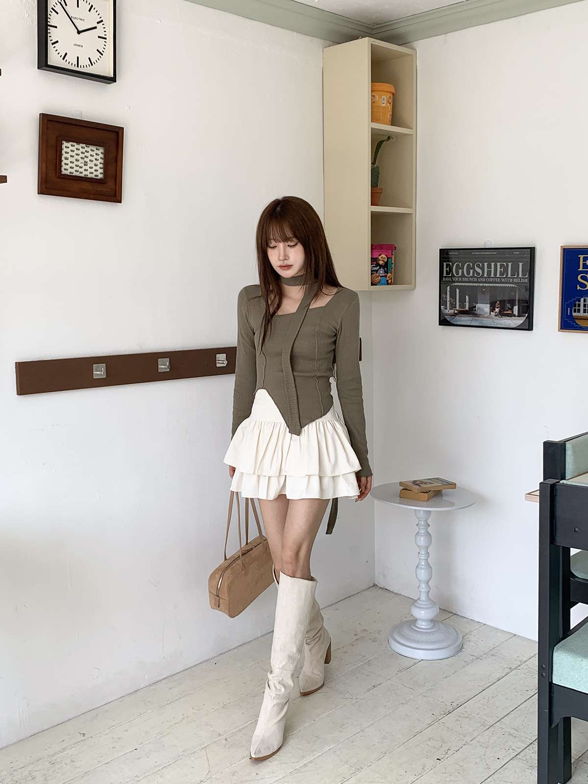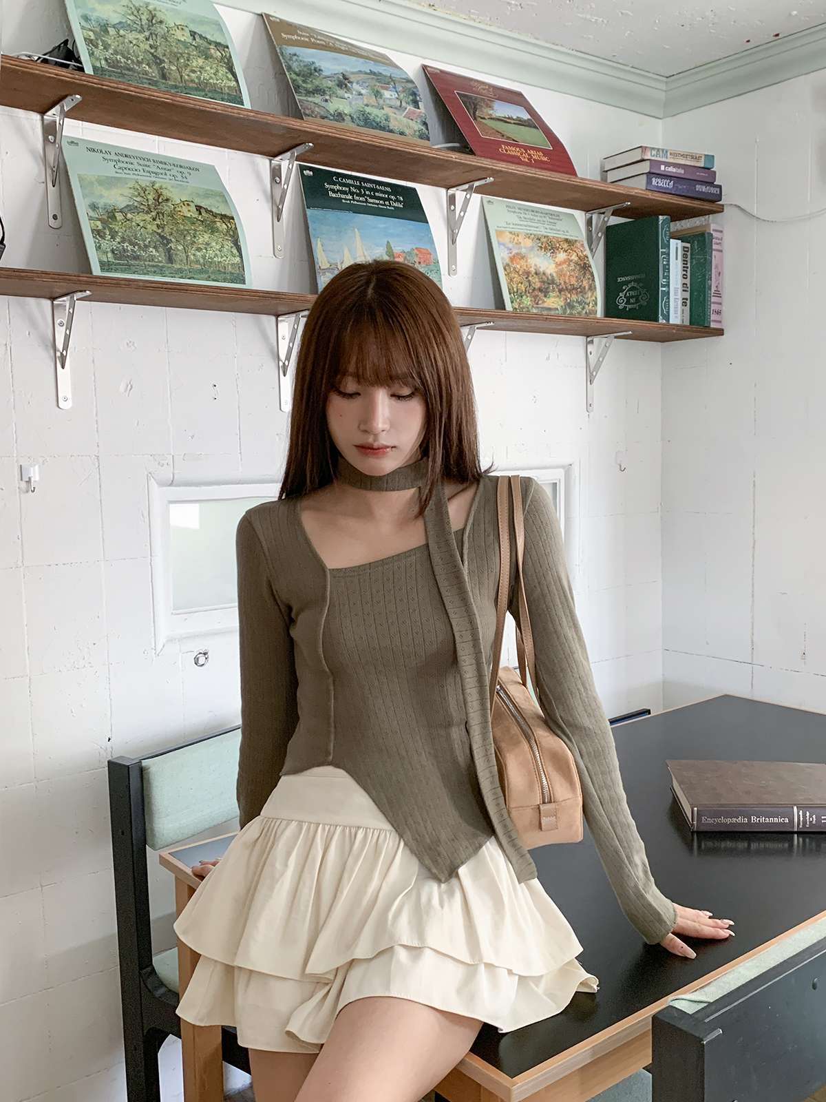 밑단 언발 트임과 키치한 무드의 스트랩 초커가 포인트 되는 니트