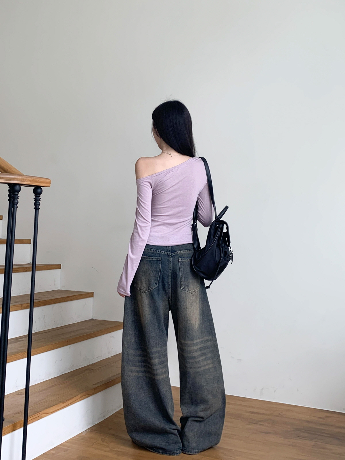 슬림하게 떨어지는 무지 오프숄더 티셔츠이며,