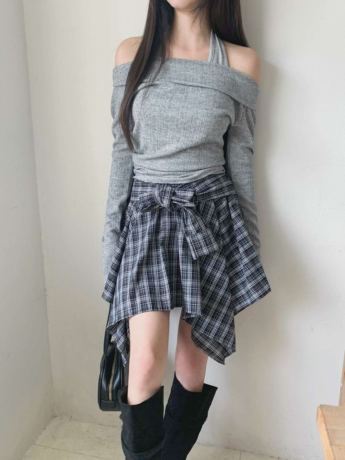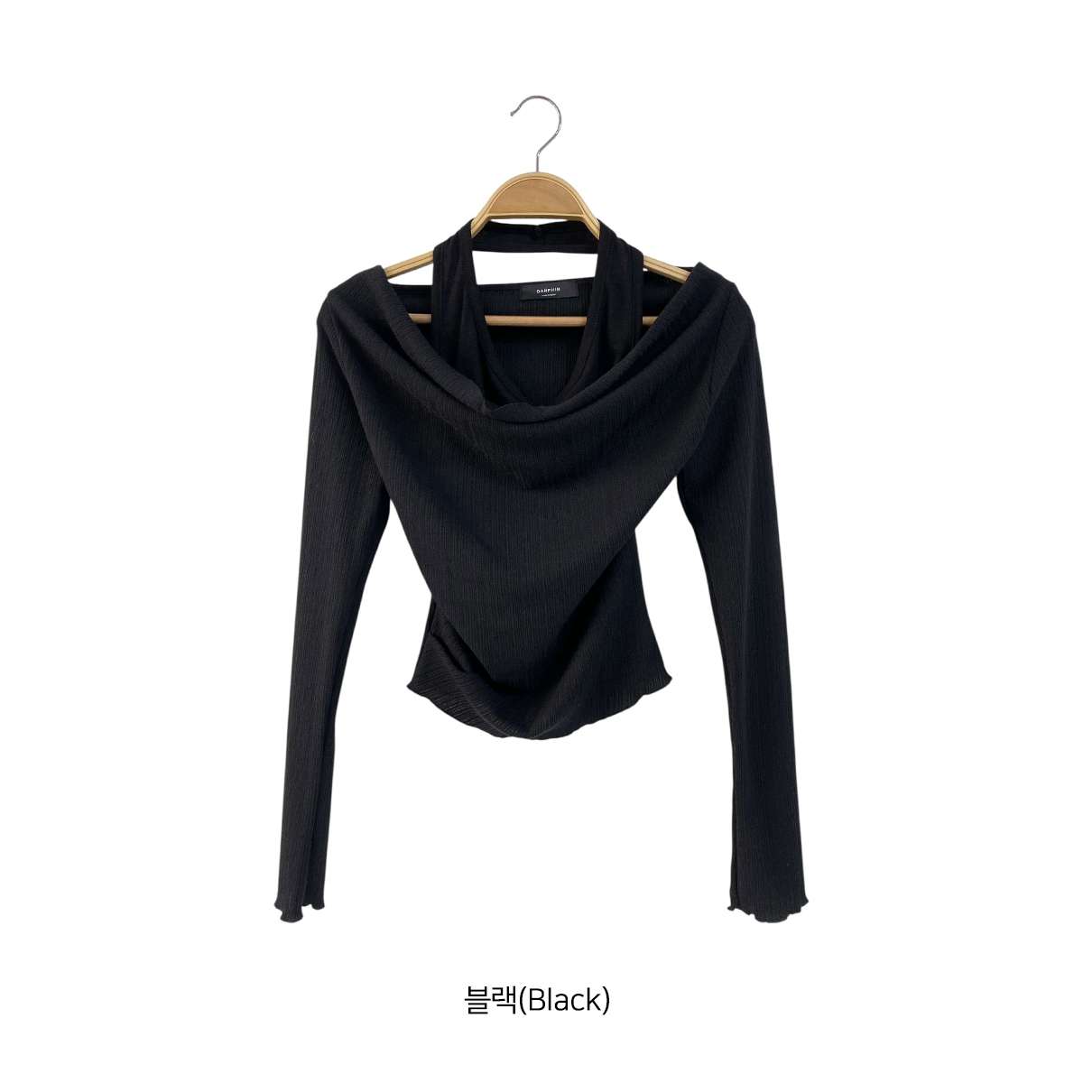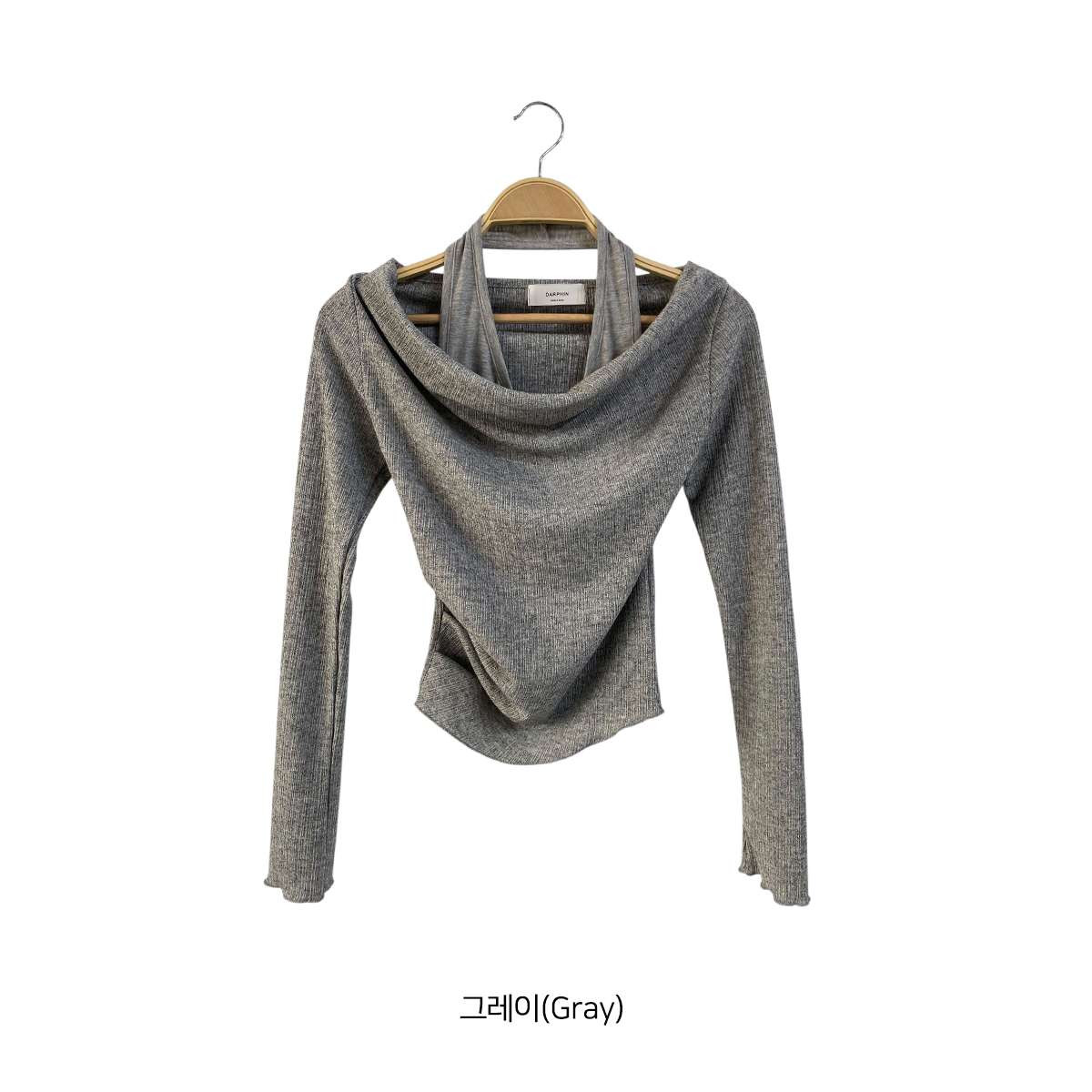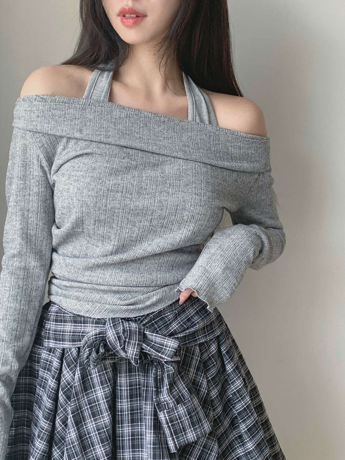 슬림한 핏감의 홀터넥 디테일이 레이어드된 오프숄더 티셔츠
