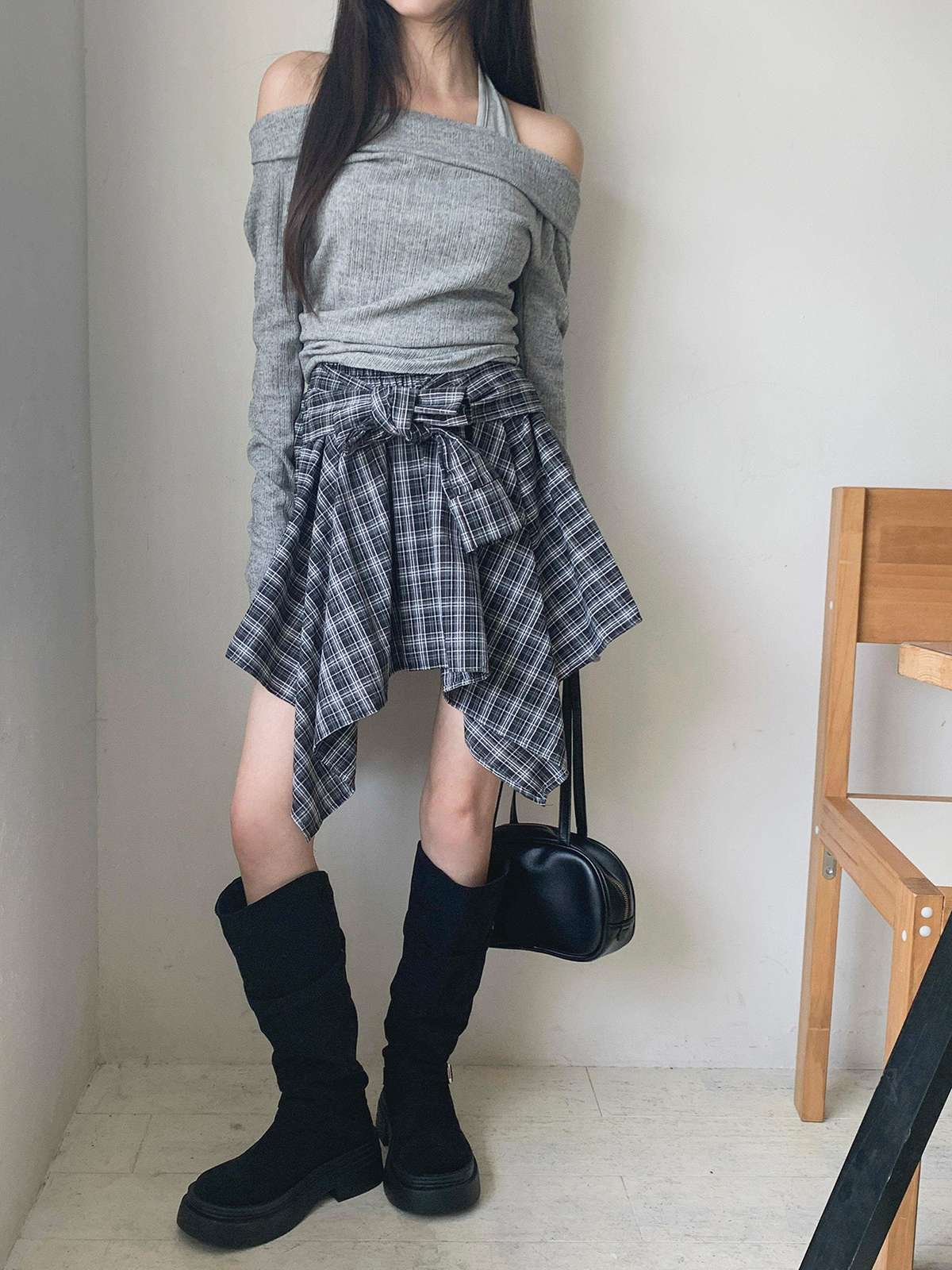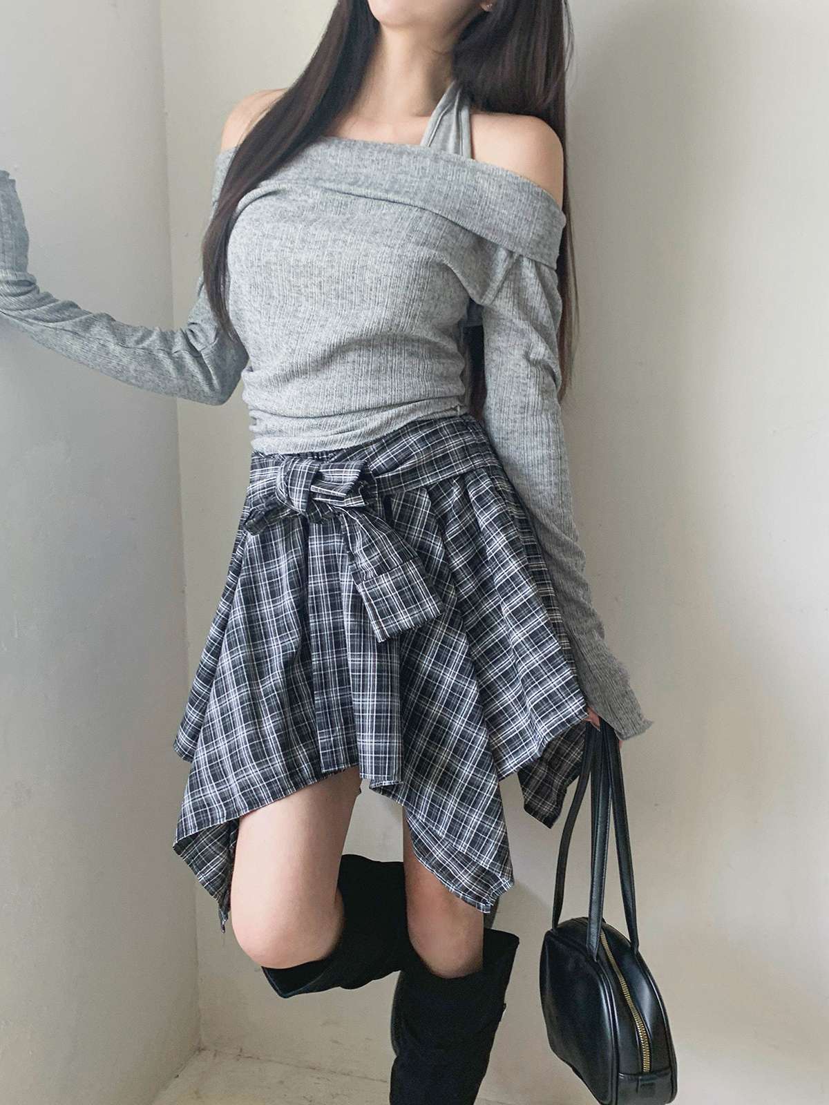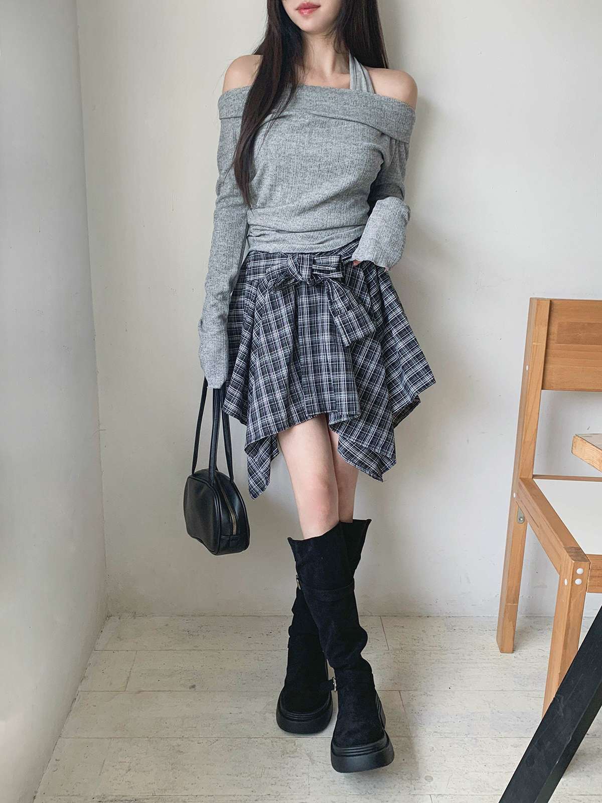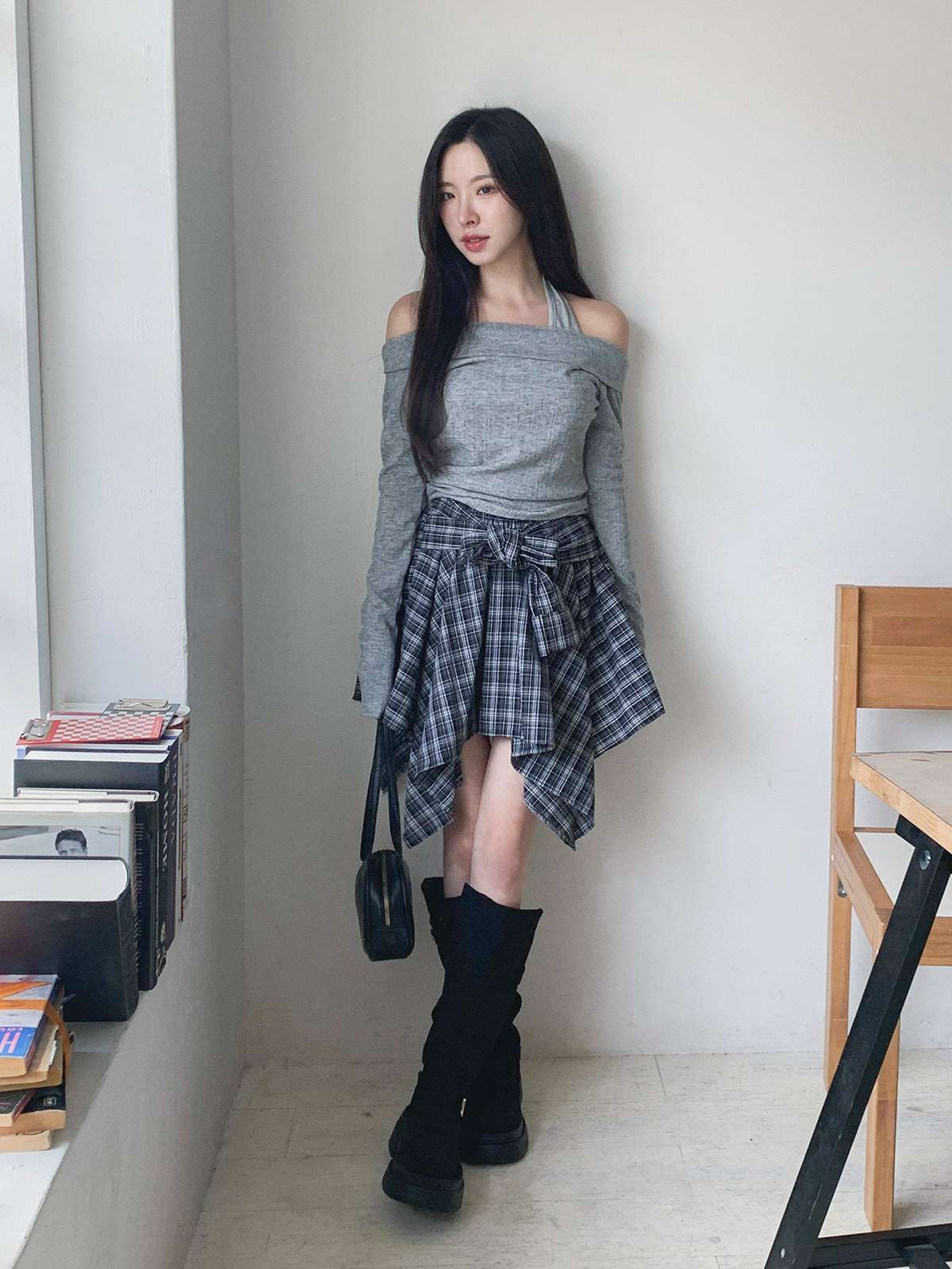 슬림한 핏감의 홀터넥 디테일이 레이어드된 오프숄더 티셔츠