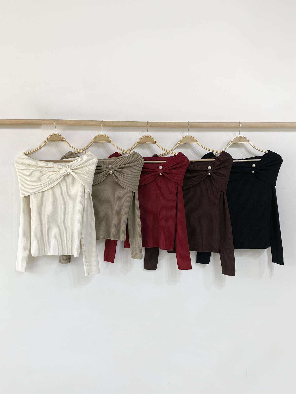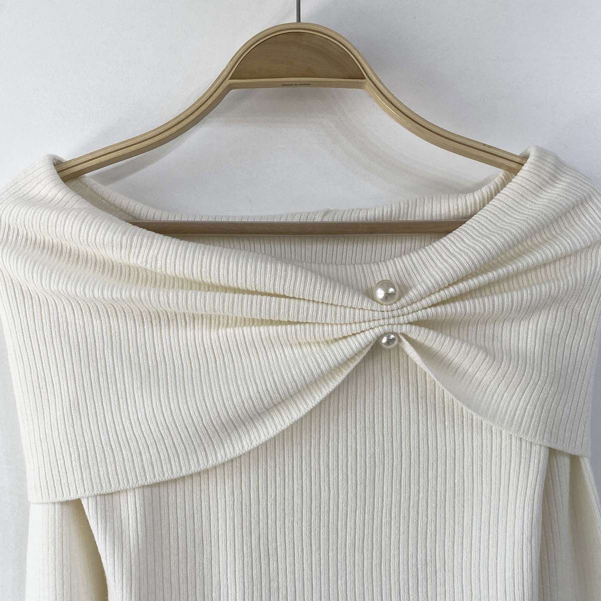 진주 포인트와 셔링 디테일의 오프숄더 골지 니트