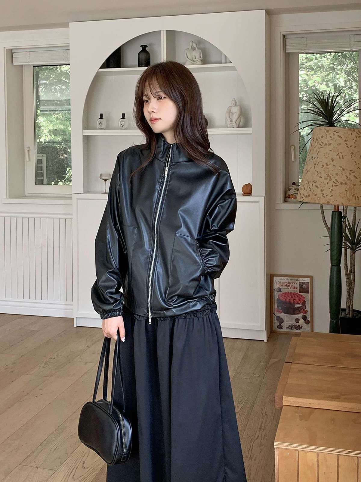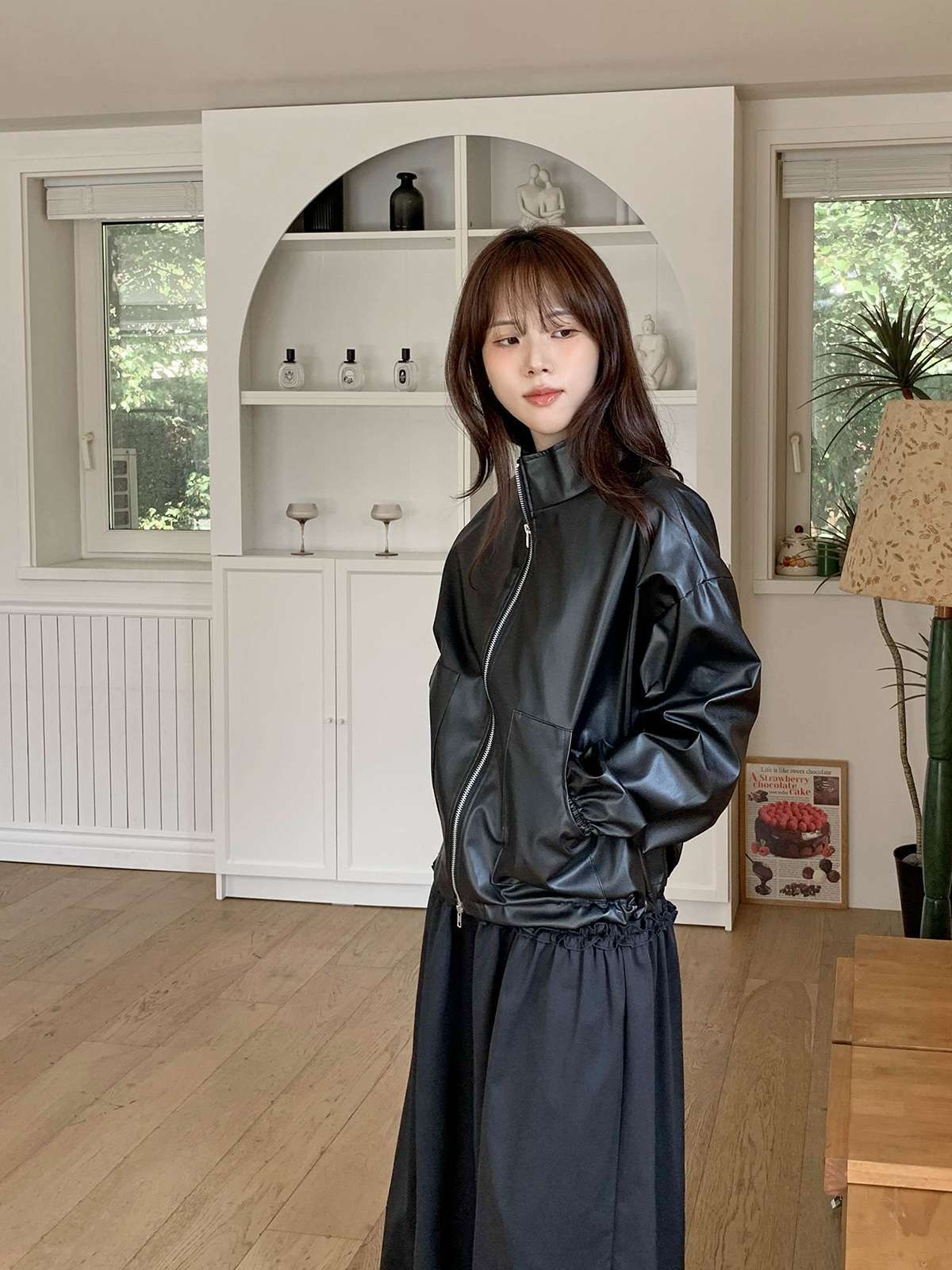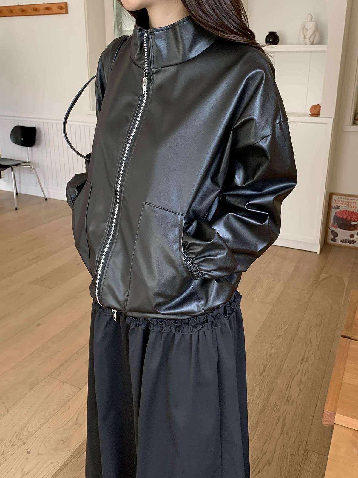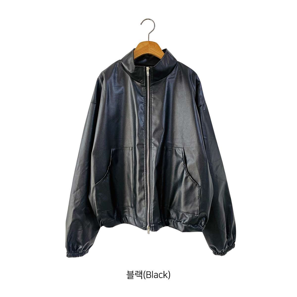 시크한 무드의 하이넥 레더 오버핏 자켓