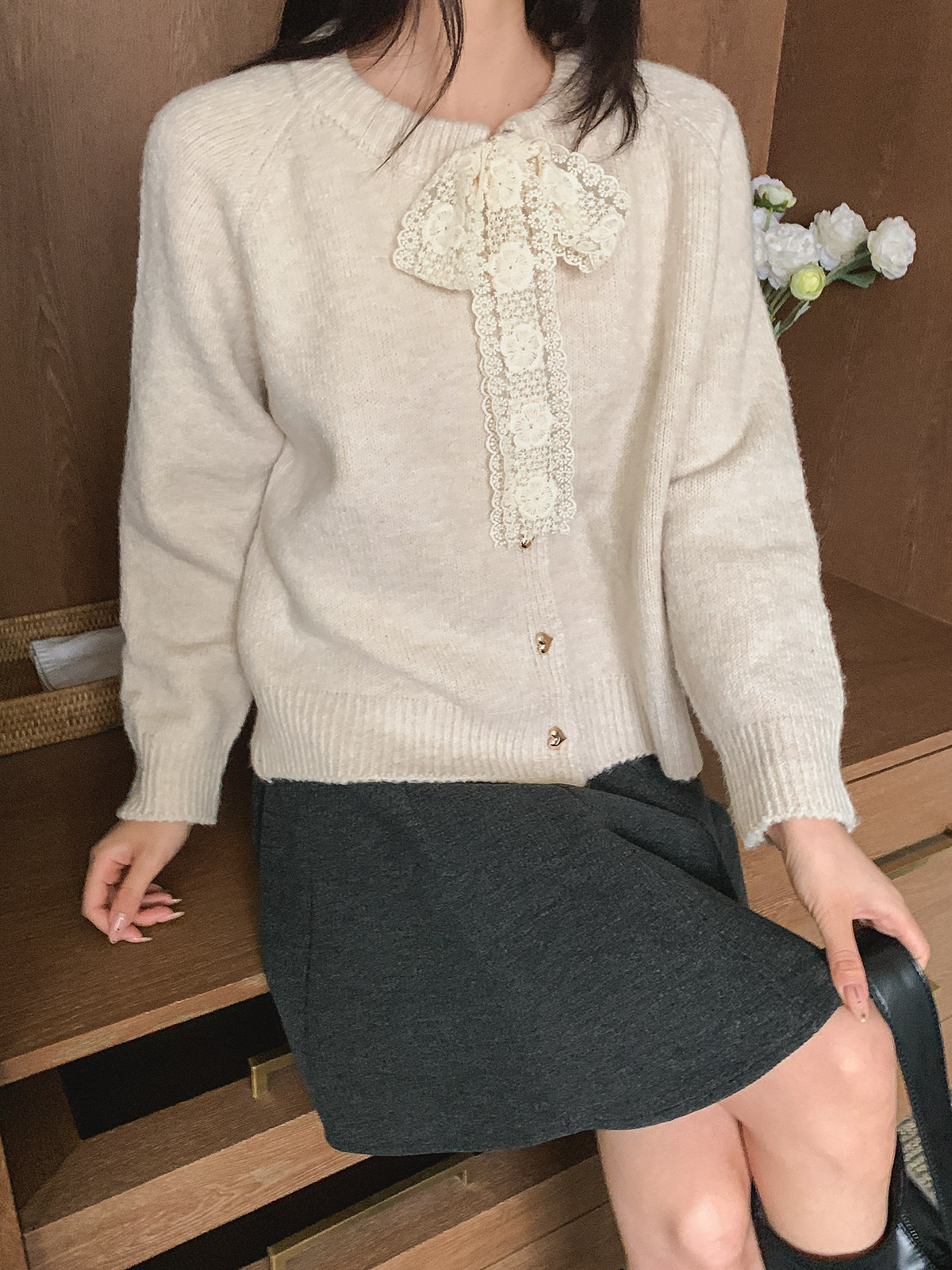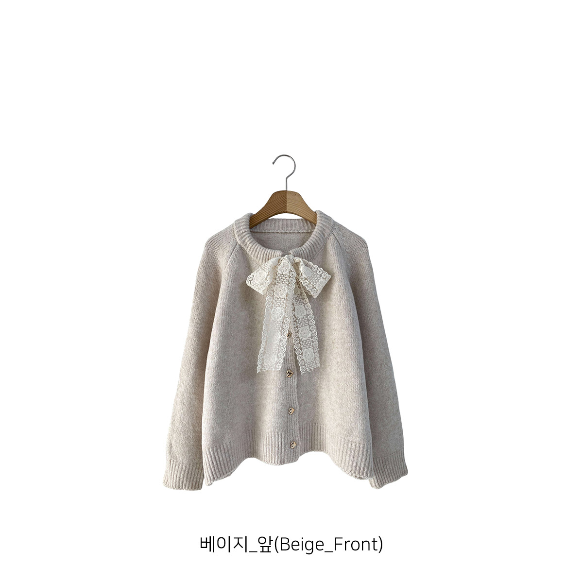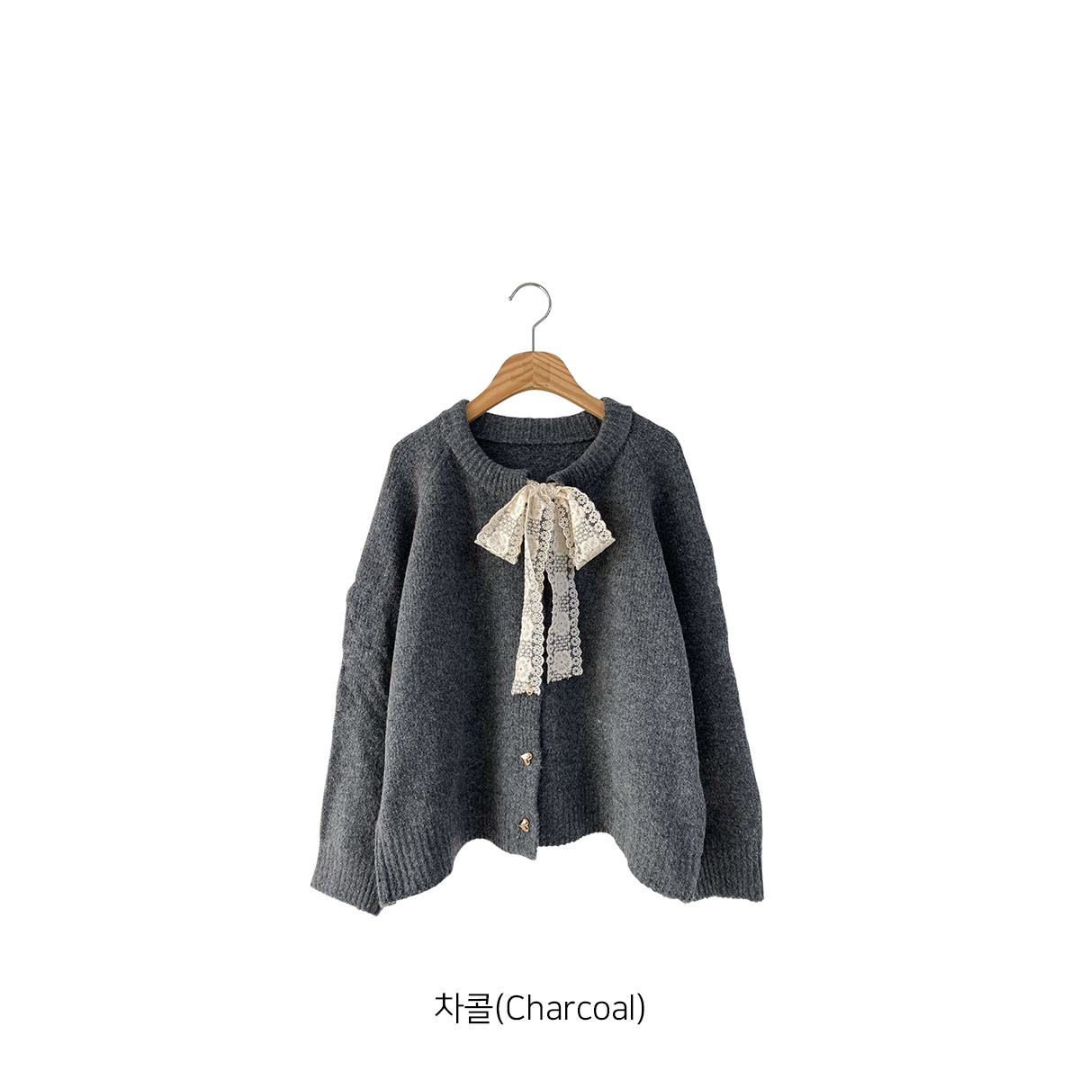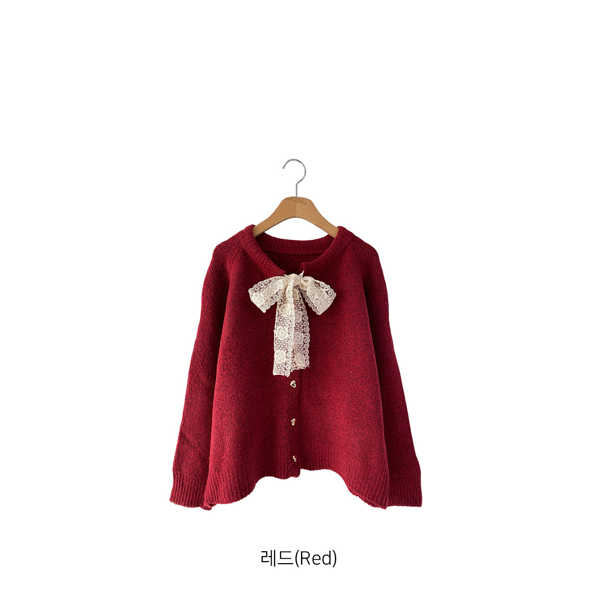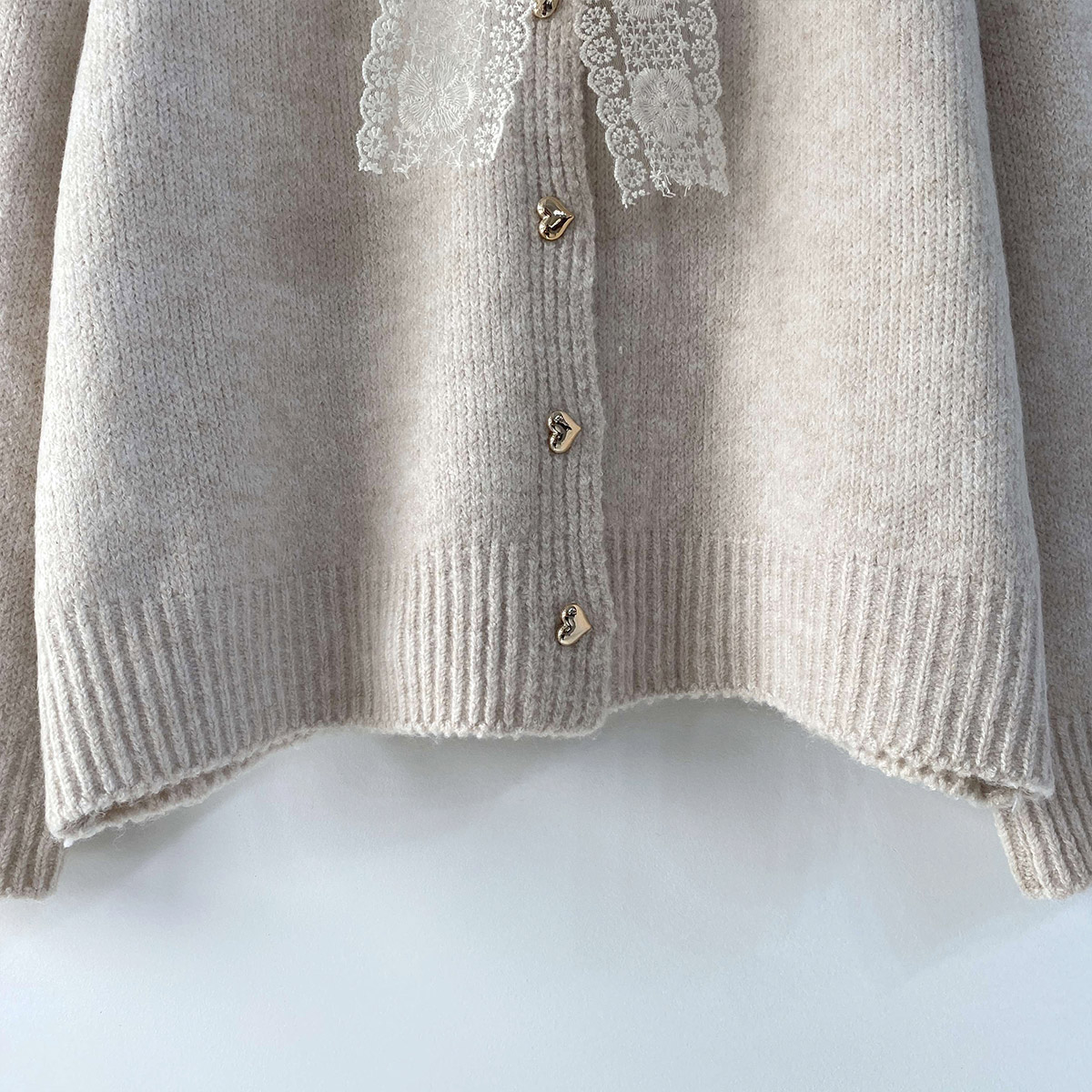 하트 버튼과 레이스 리본이 포인트인 니트 가디건