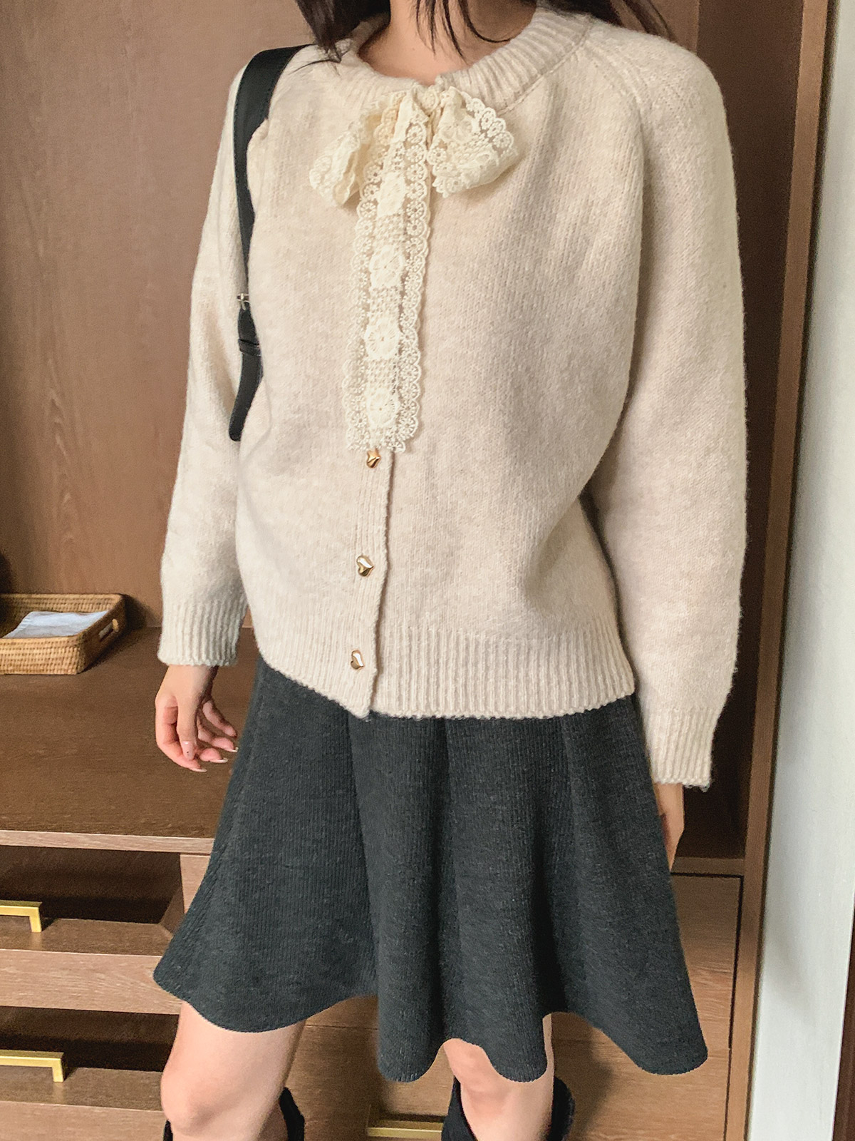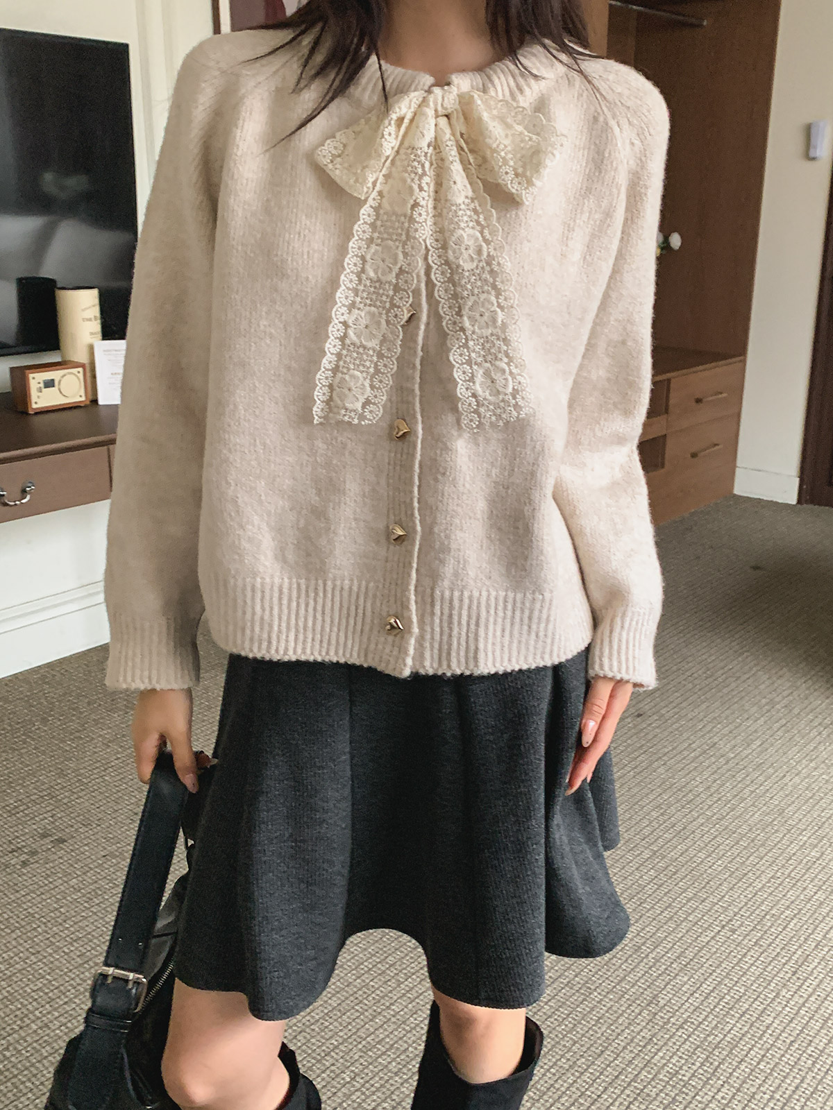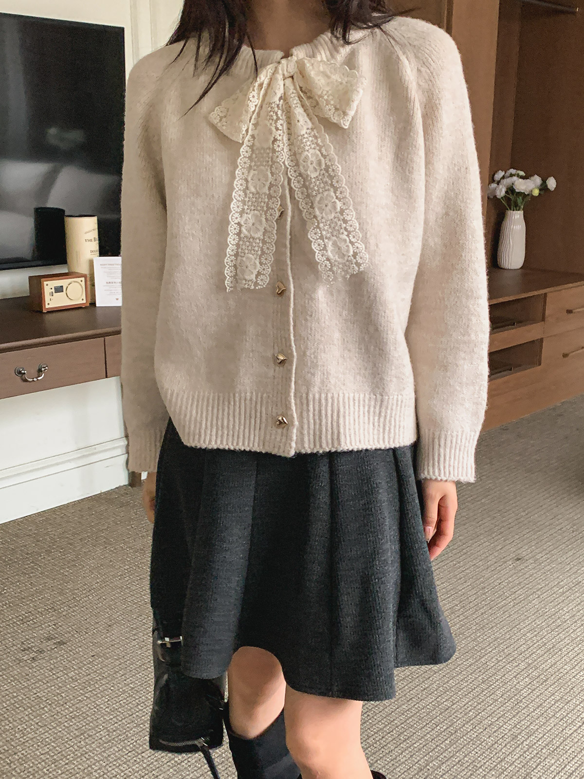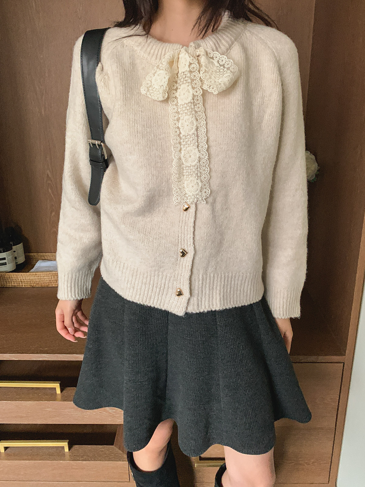 하트 버튼과 레이스 리본이 포인트인 니트 가디건