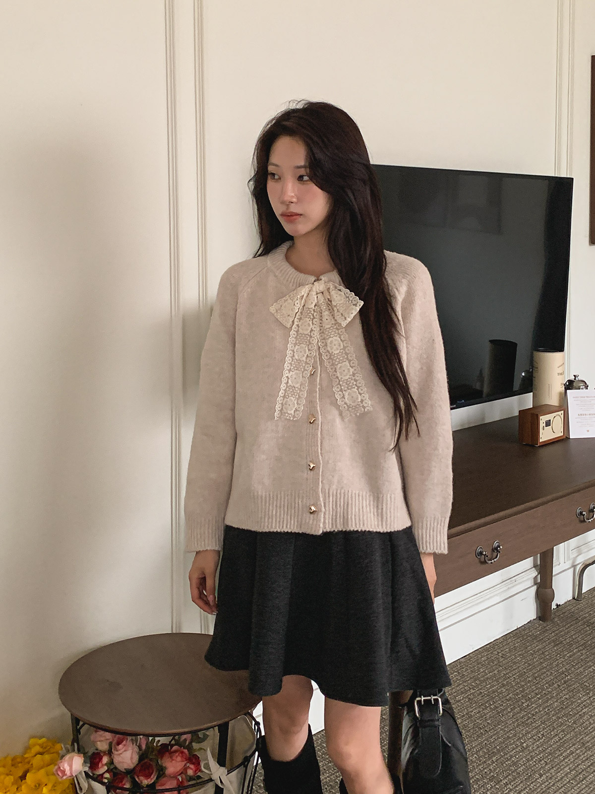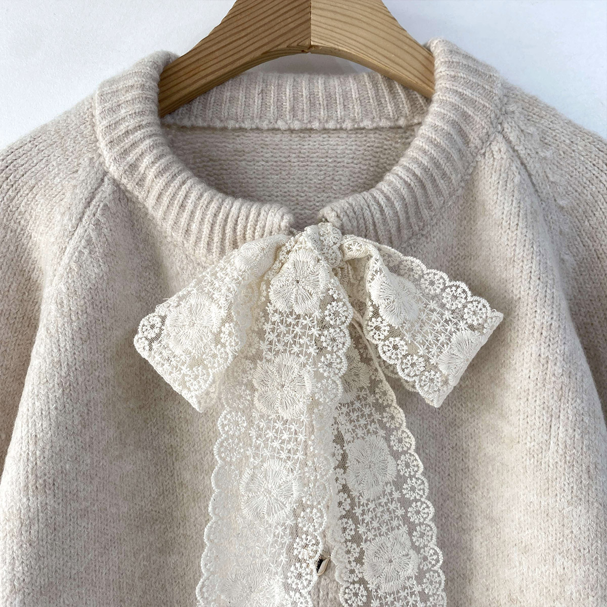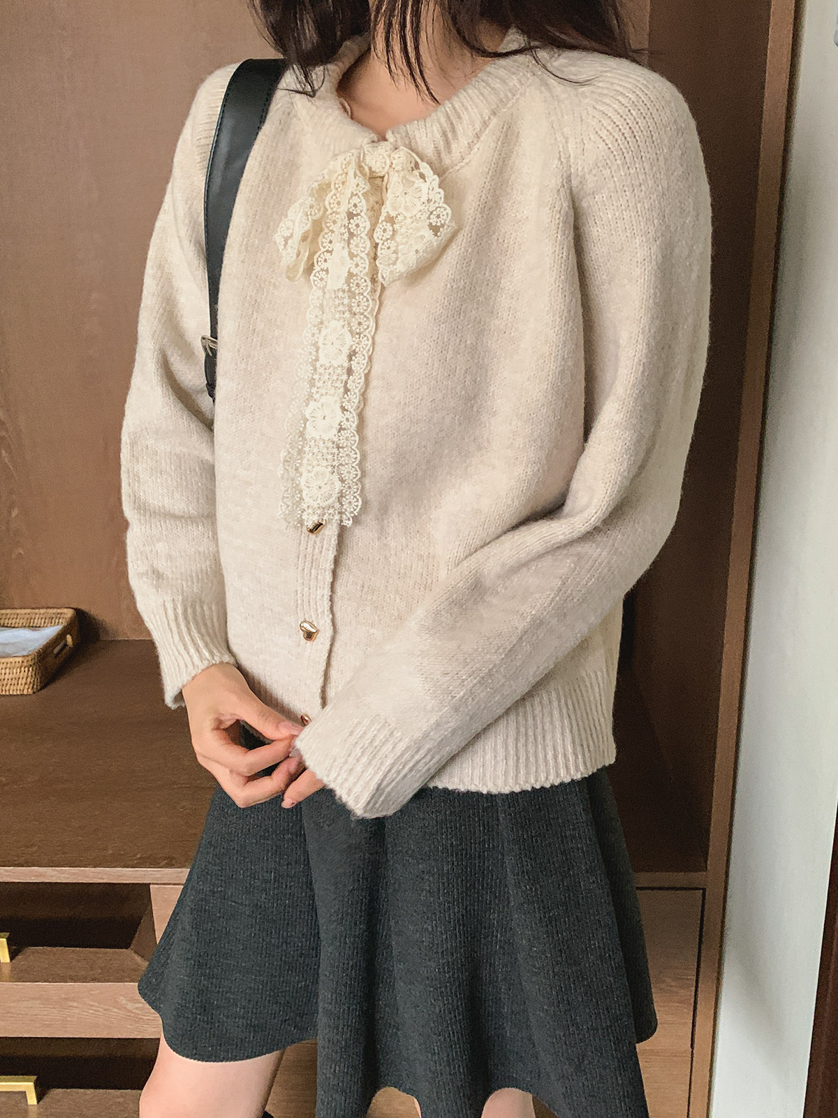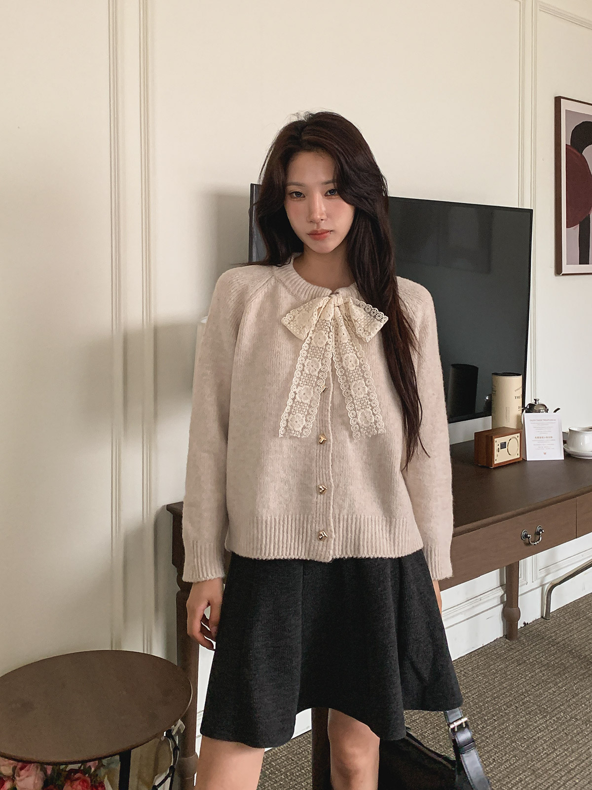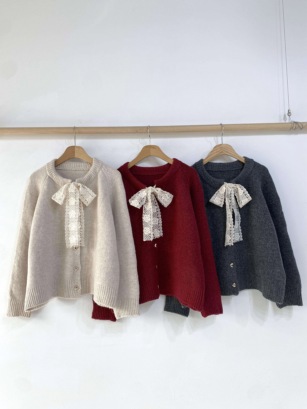 하트 버튼과 레이스 리본이 포인트인 니트 가디건