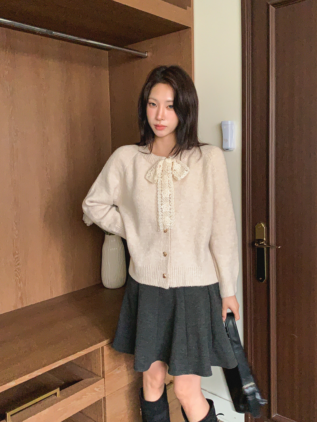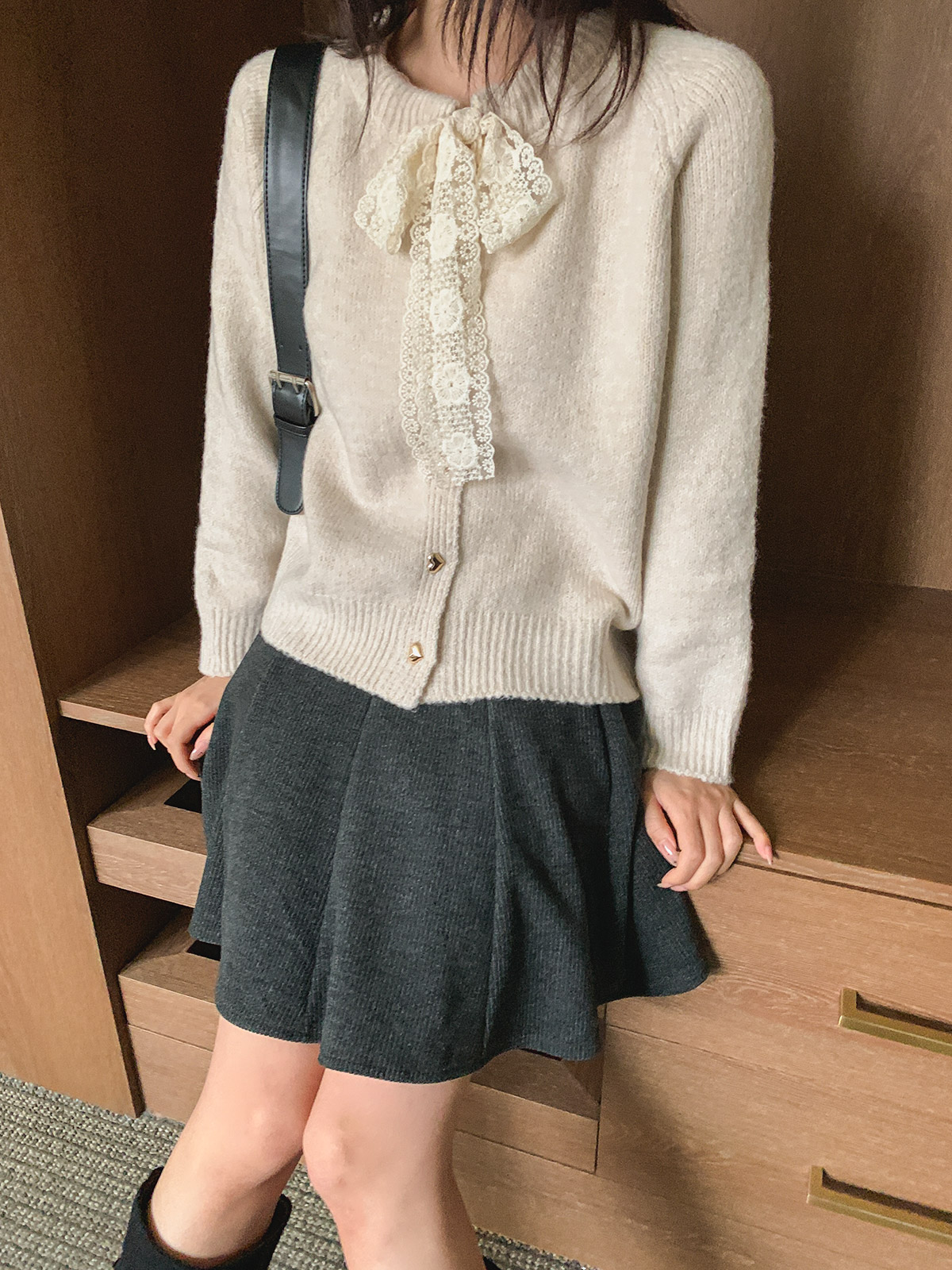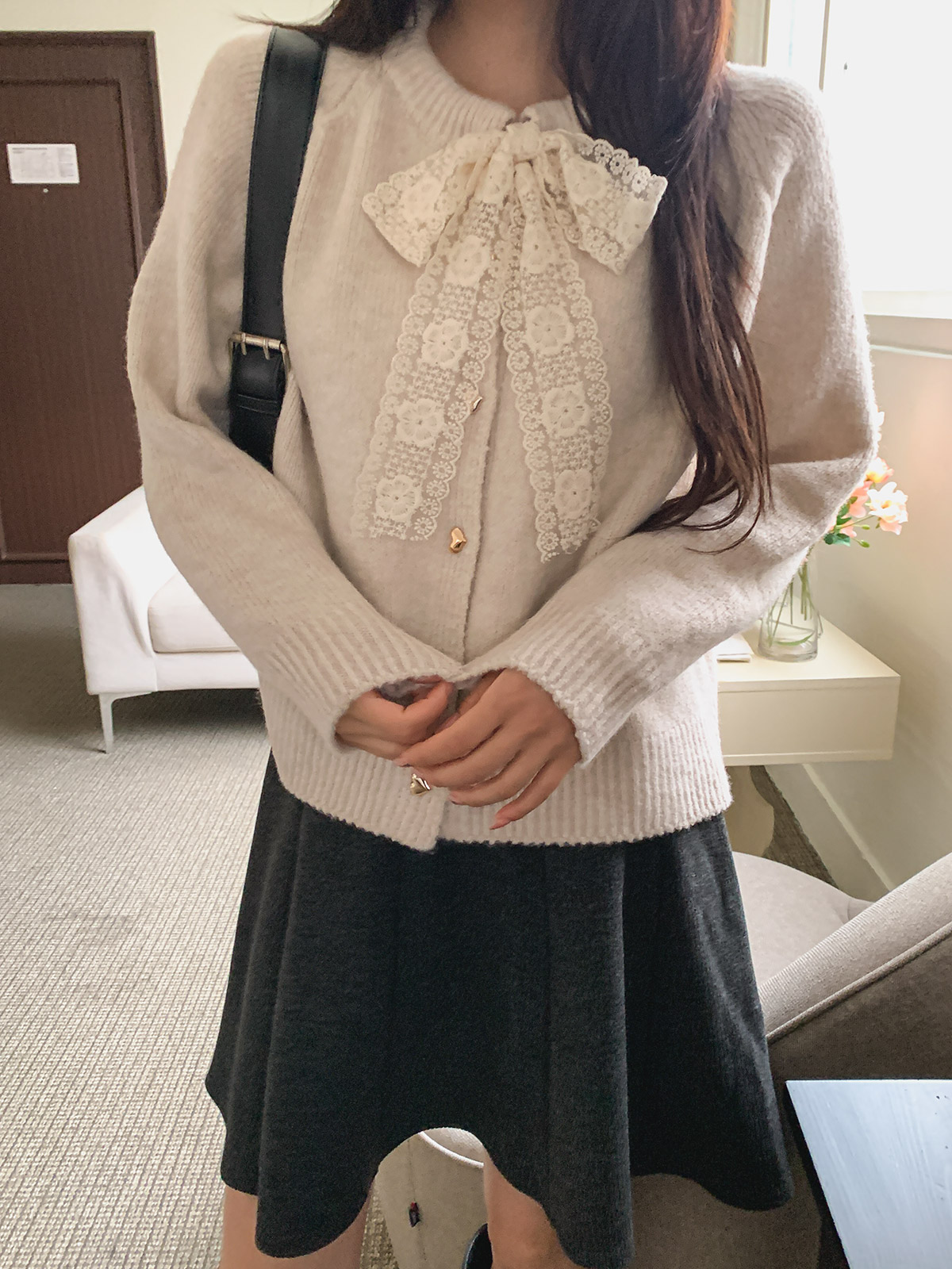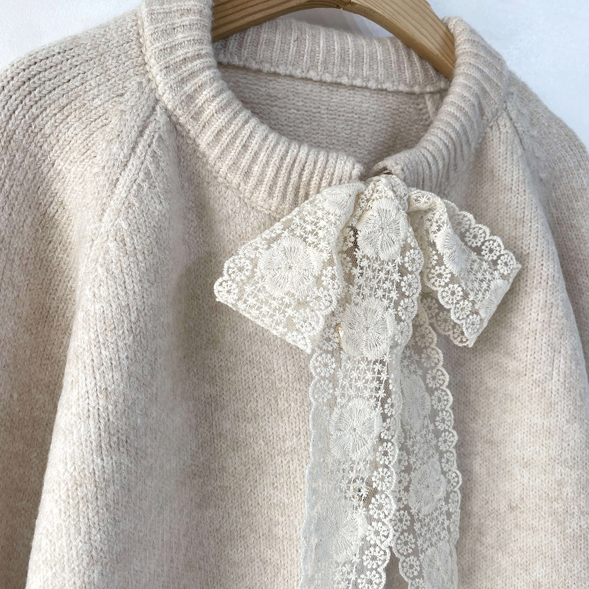 하트 버튼과 레이스 리본이 포인트인 니트 가디건