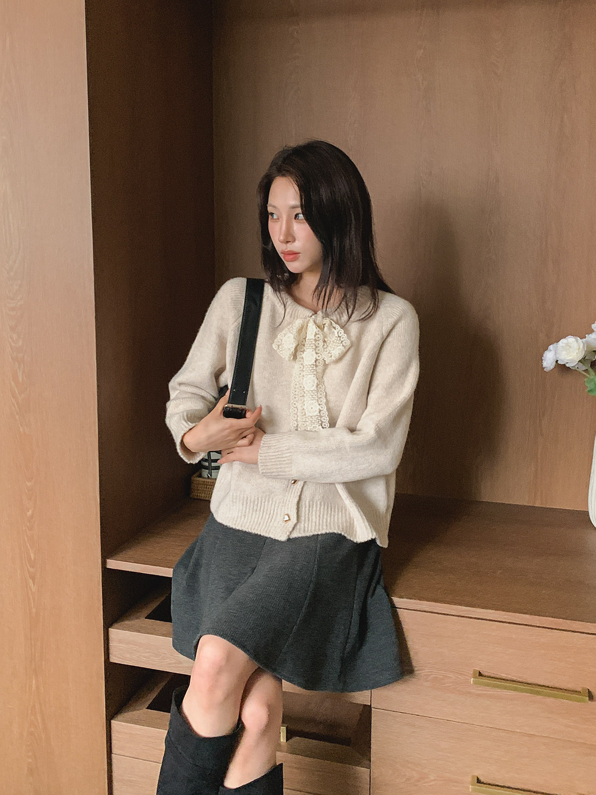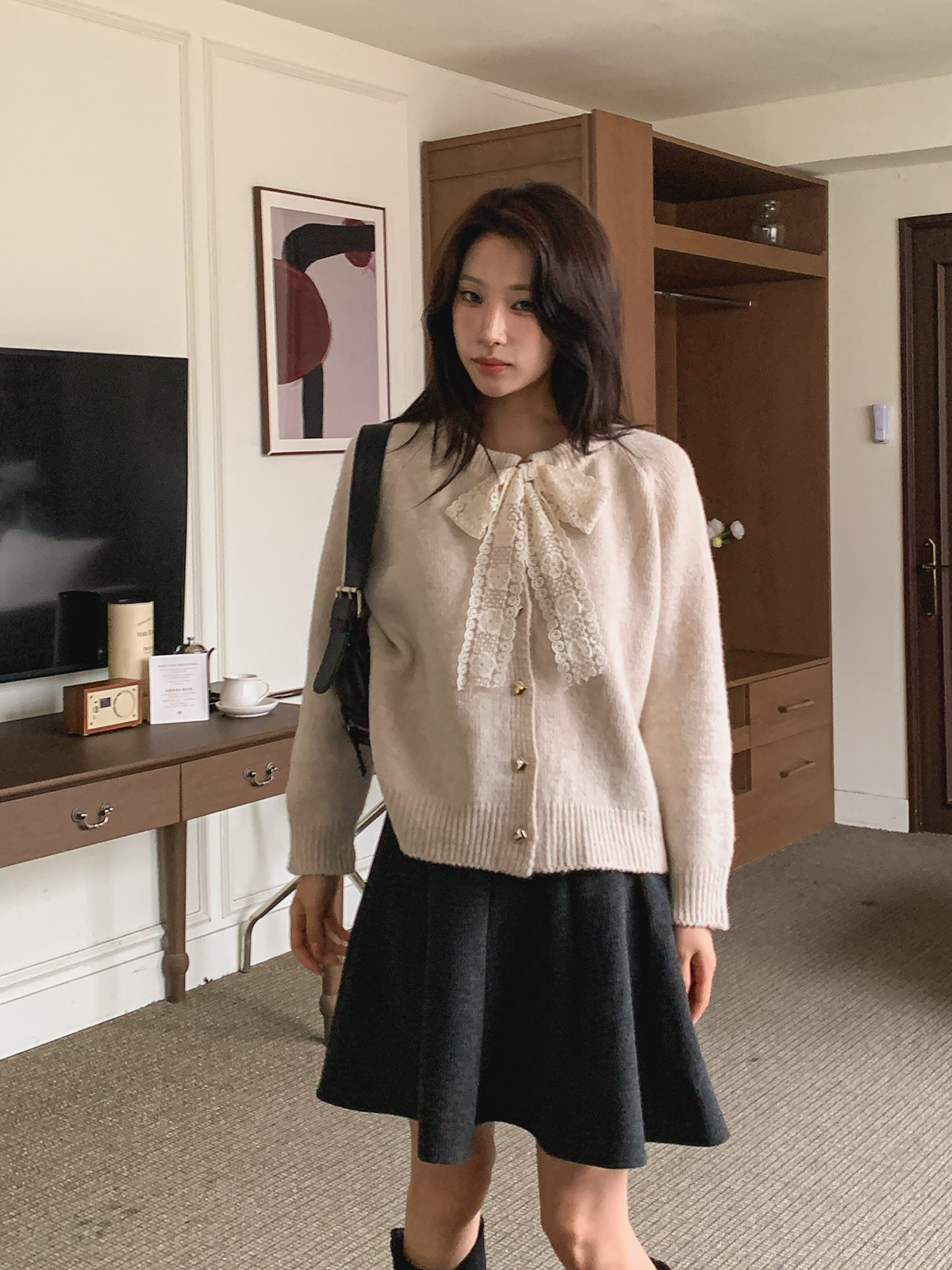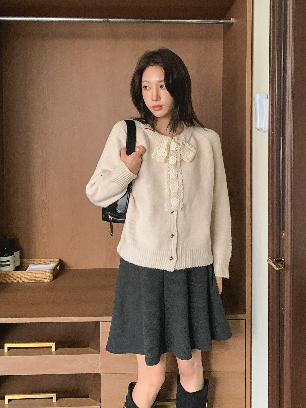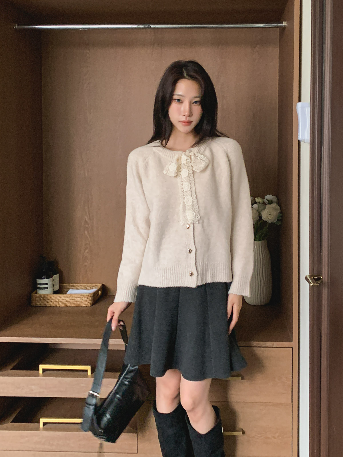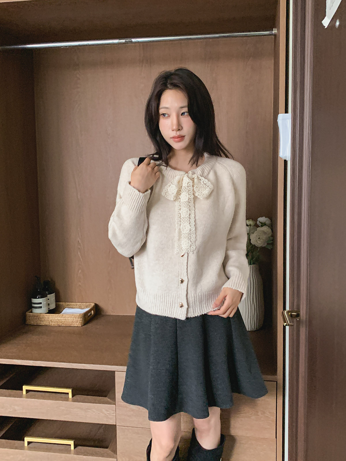 하트 버튼과 레이스 리본이 포인트인 니트 가디건