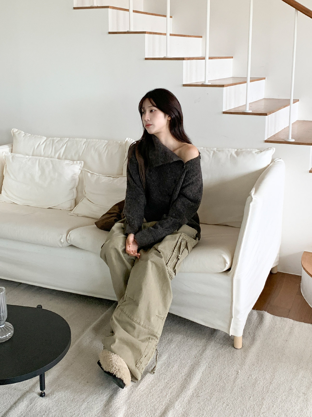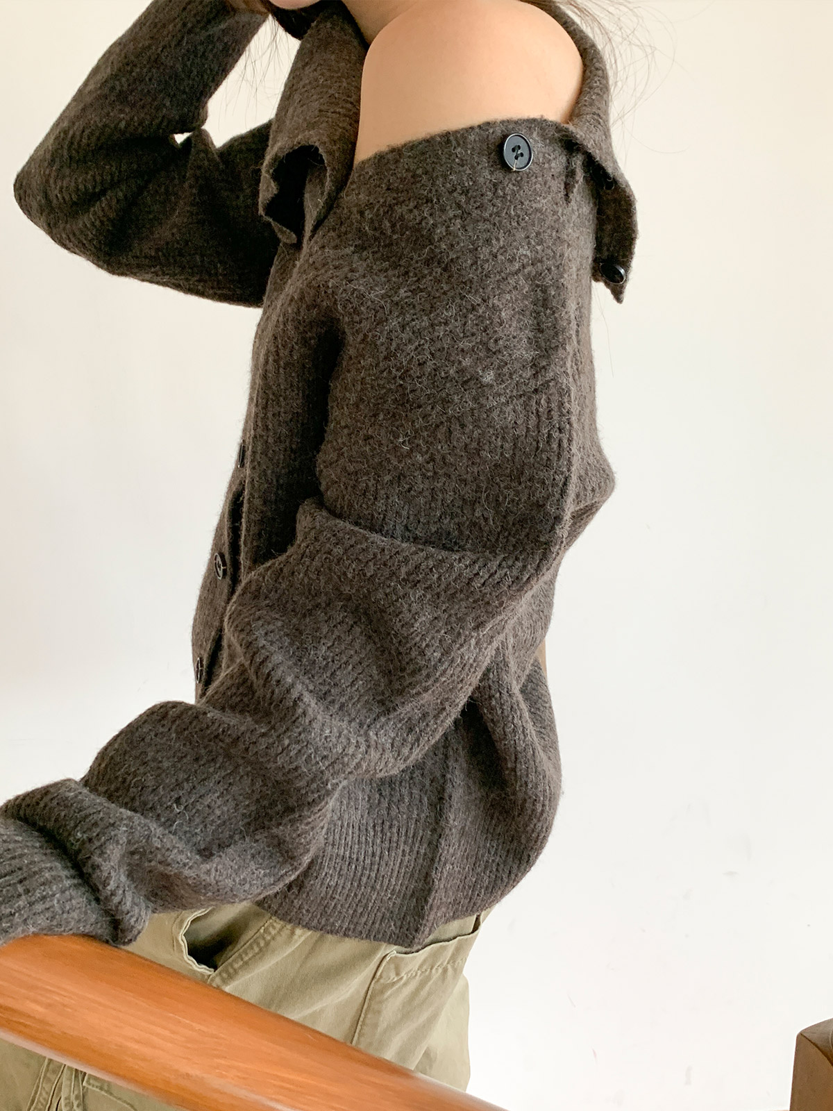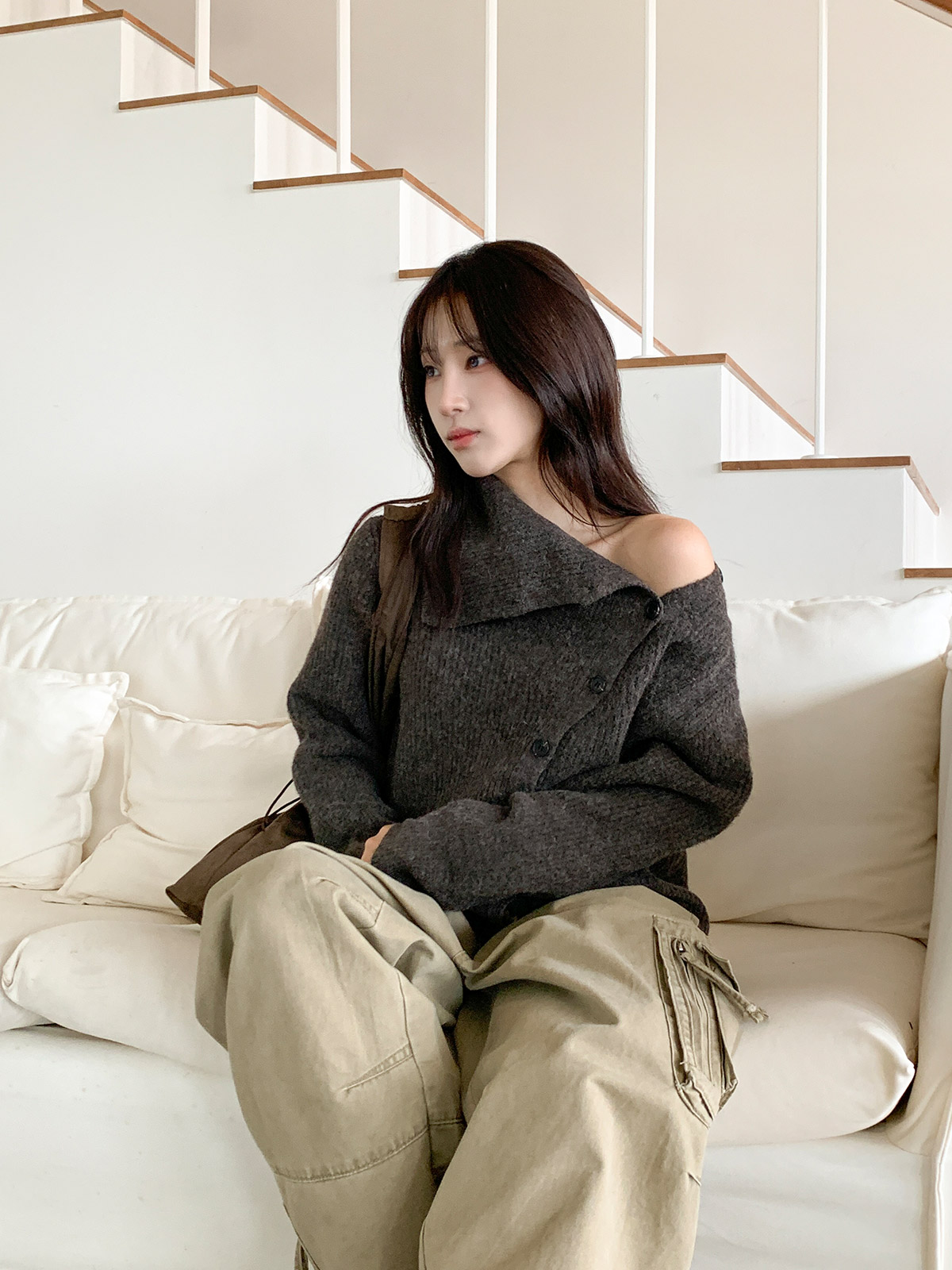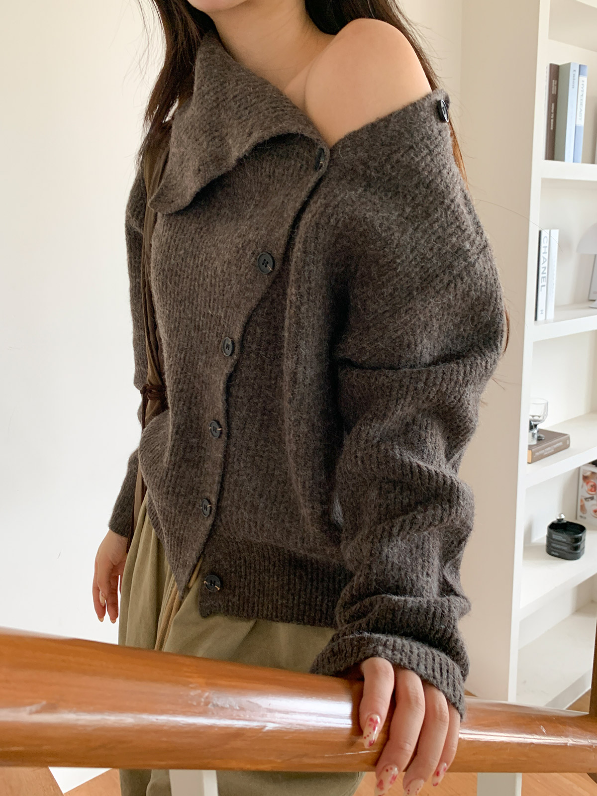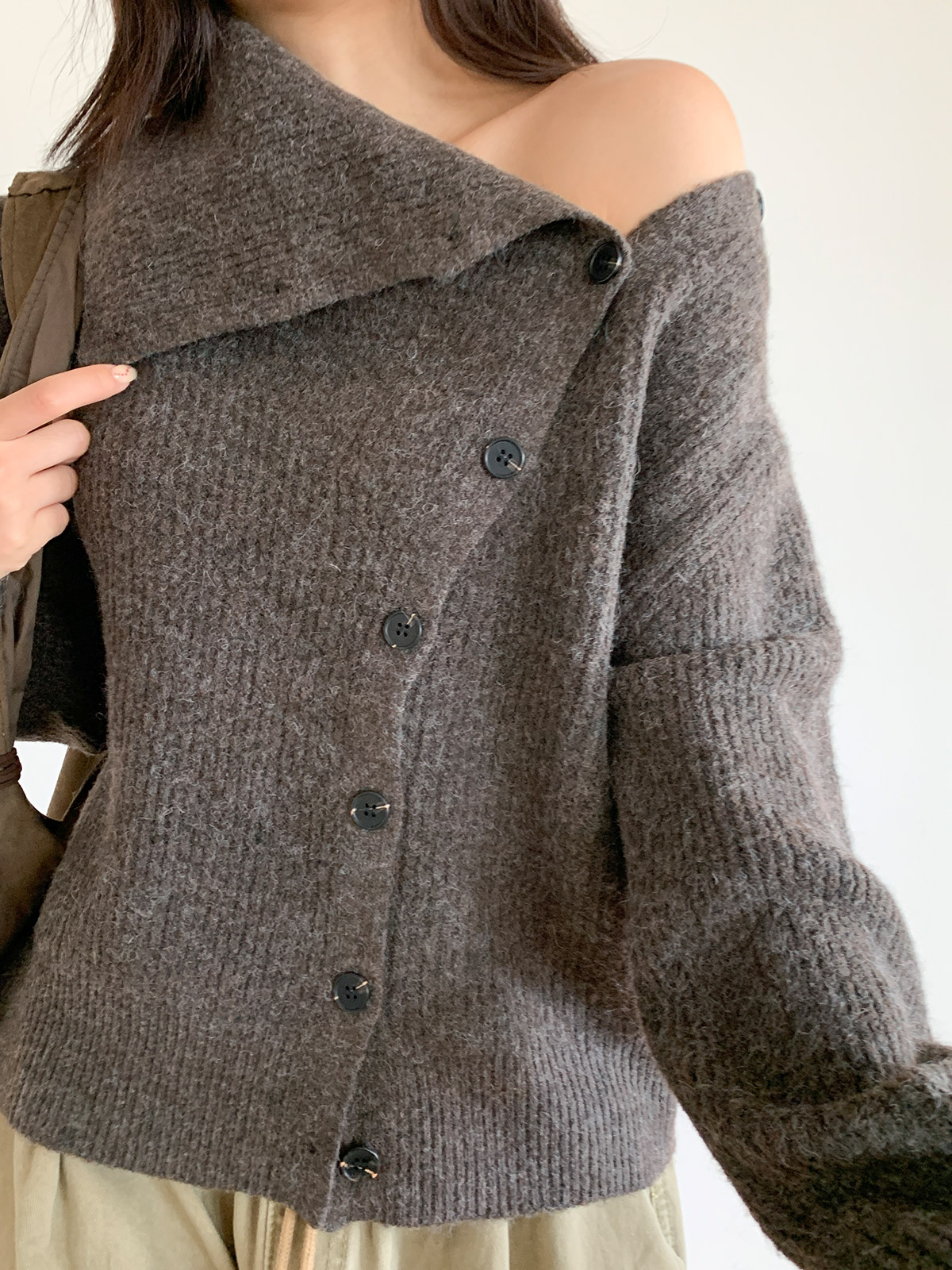 포인트 되는 코디로 딱인 언발 울 니트 가디건으로