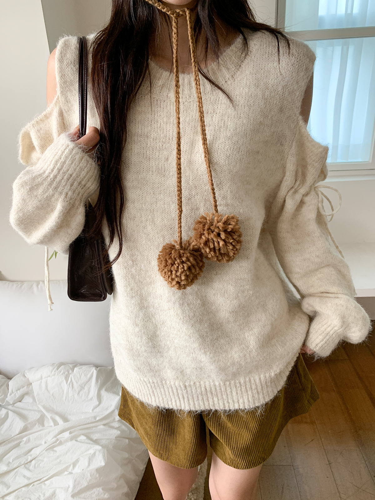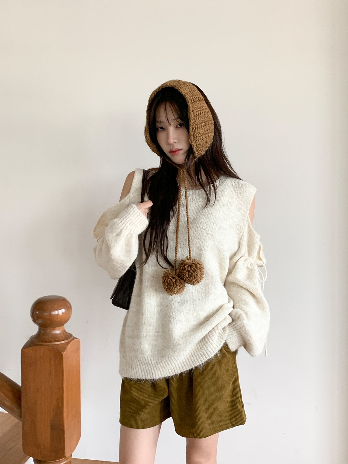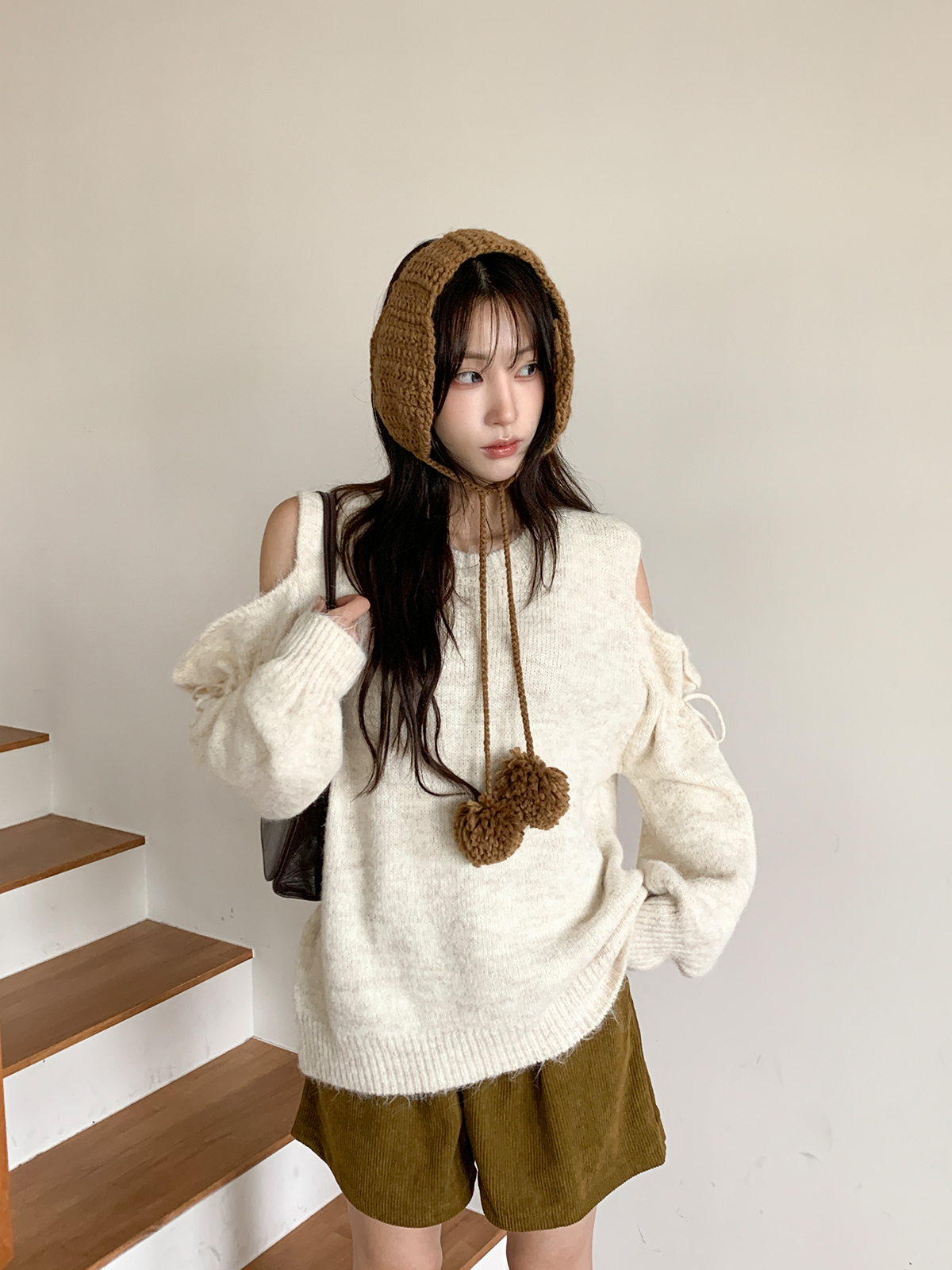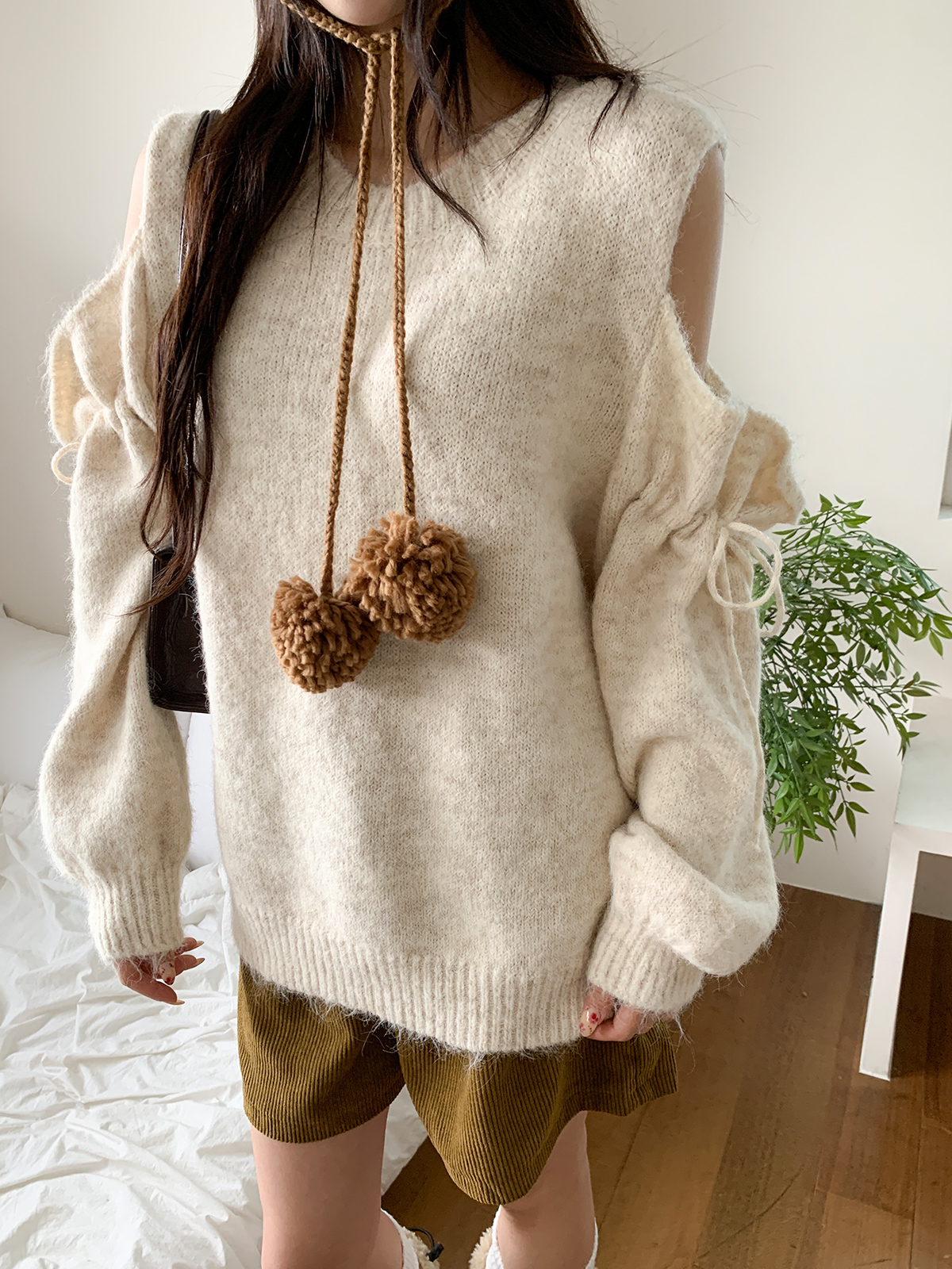 루즈한 핏이 포근한 무드를 주는 어깨 트임 니트