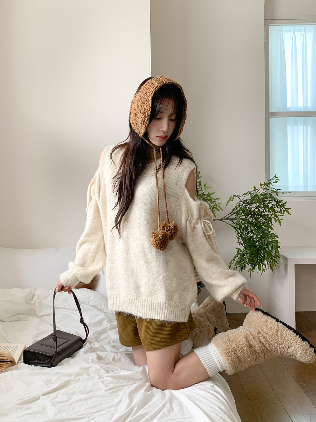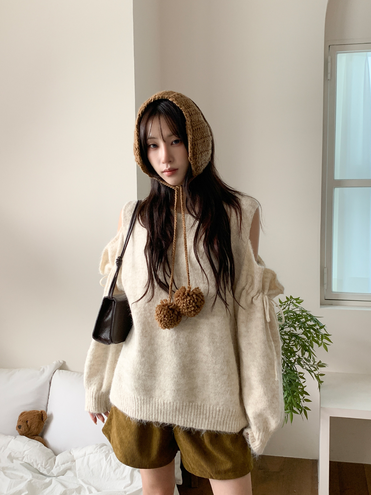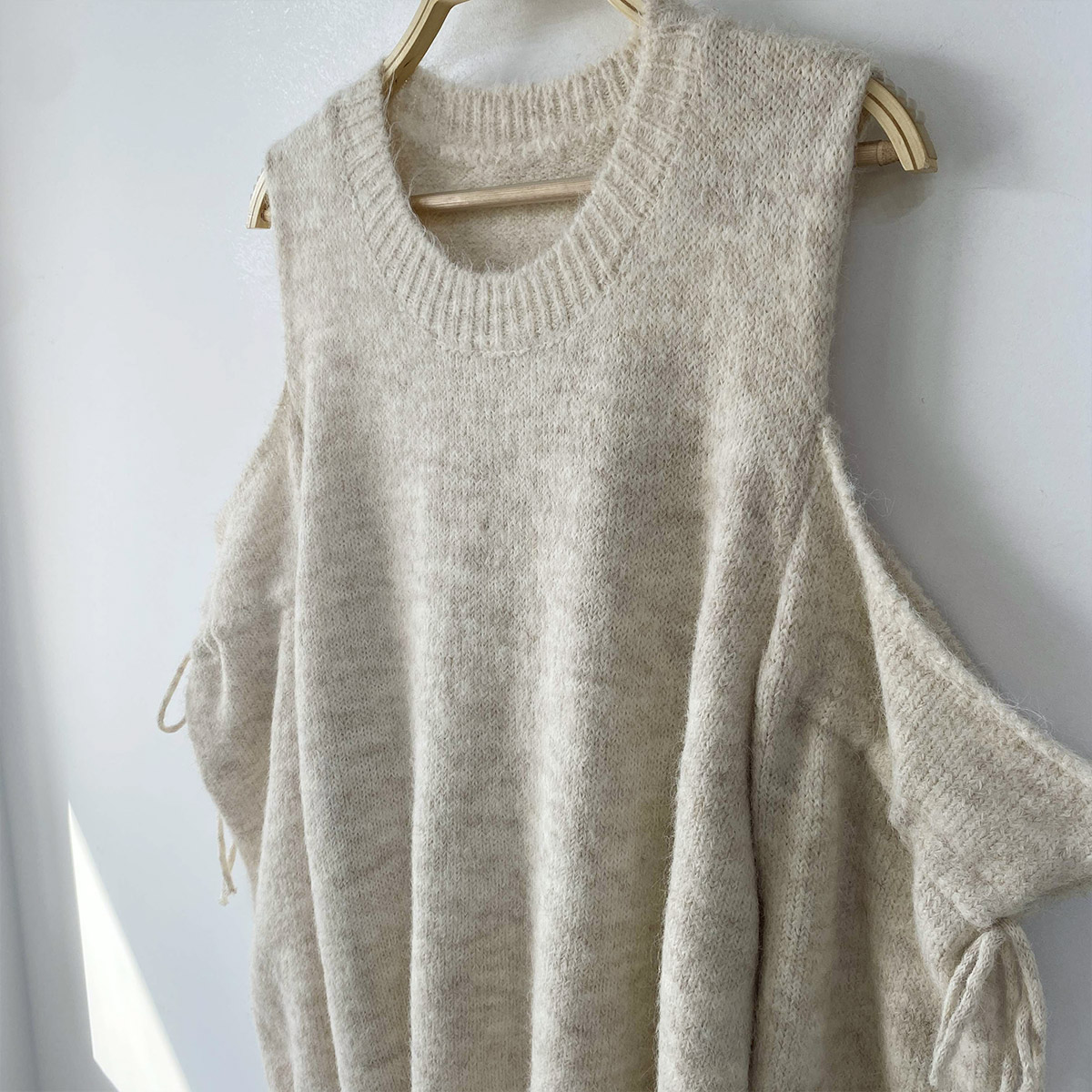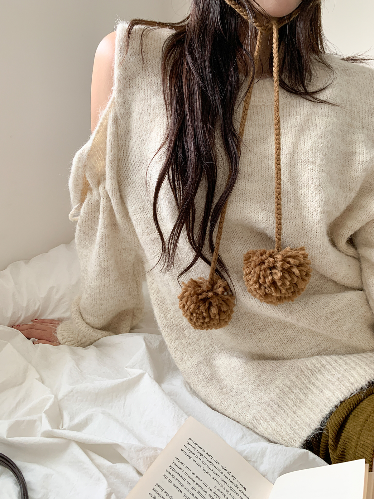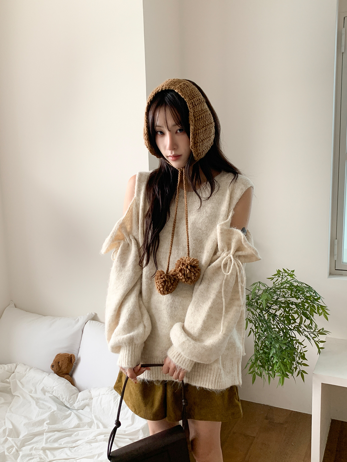 루즈한 핏이 포근한 무드를 주는 어깨 트임 니트
