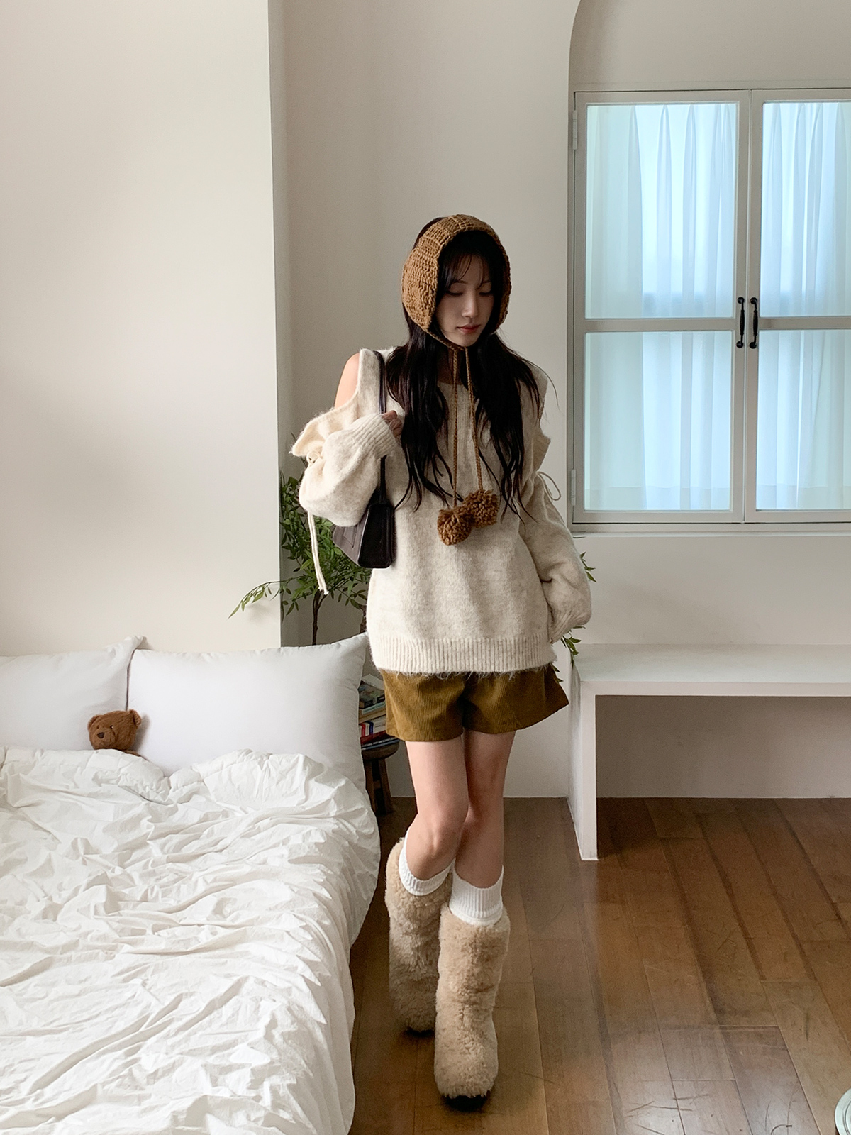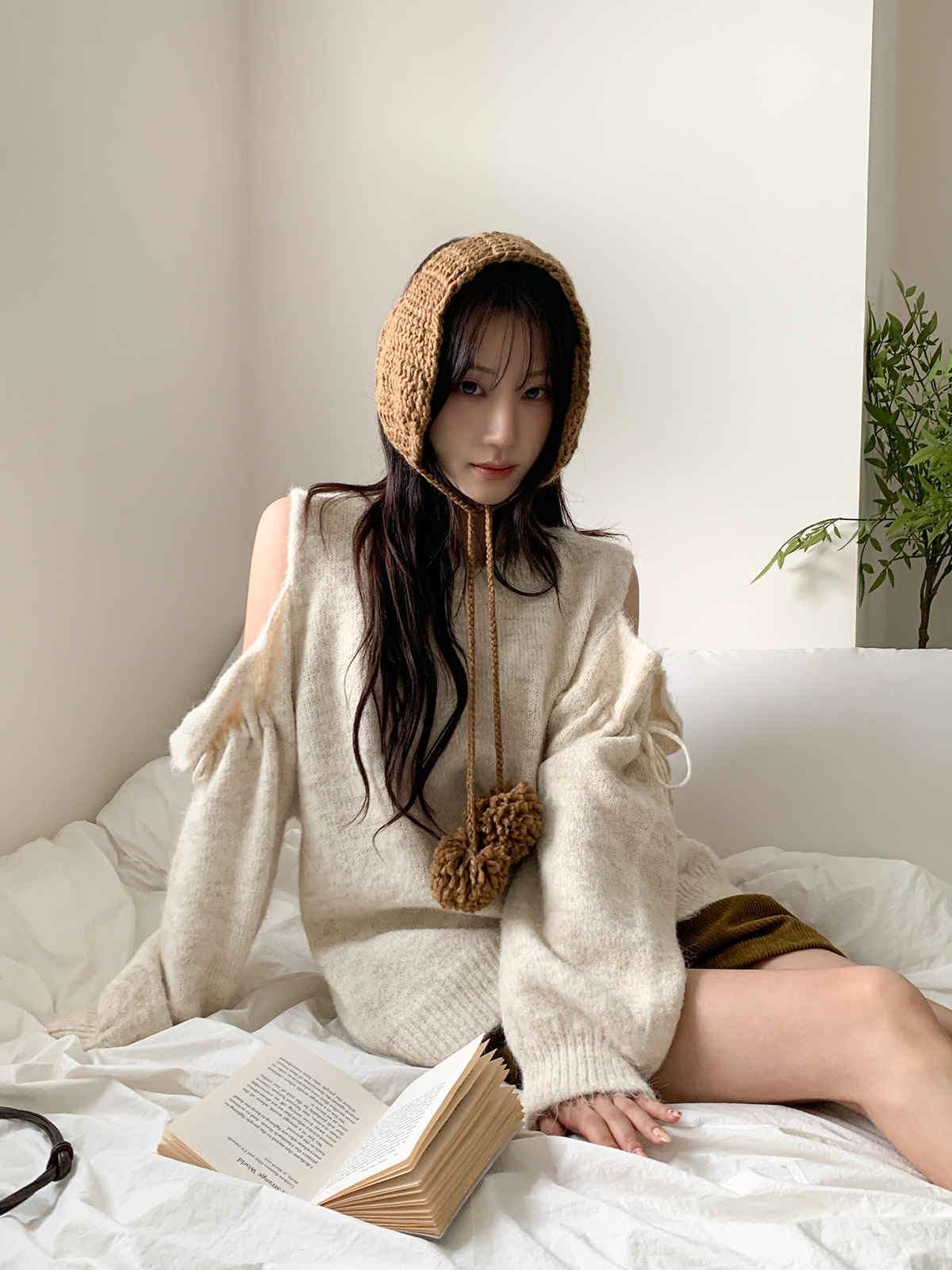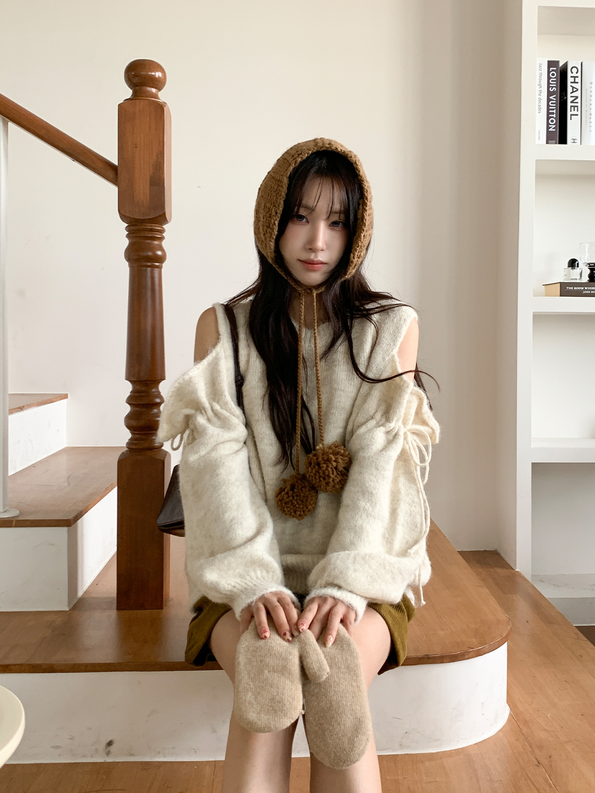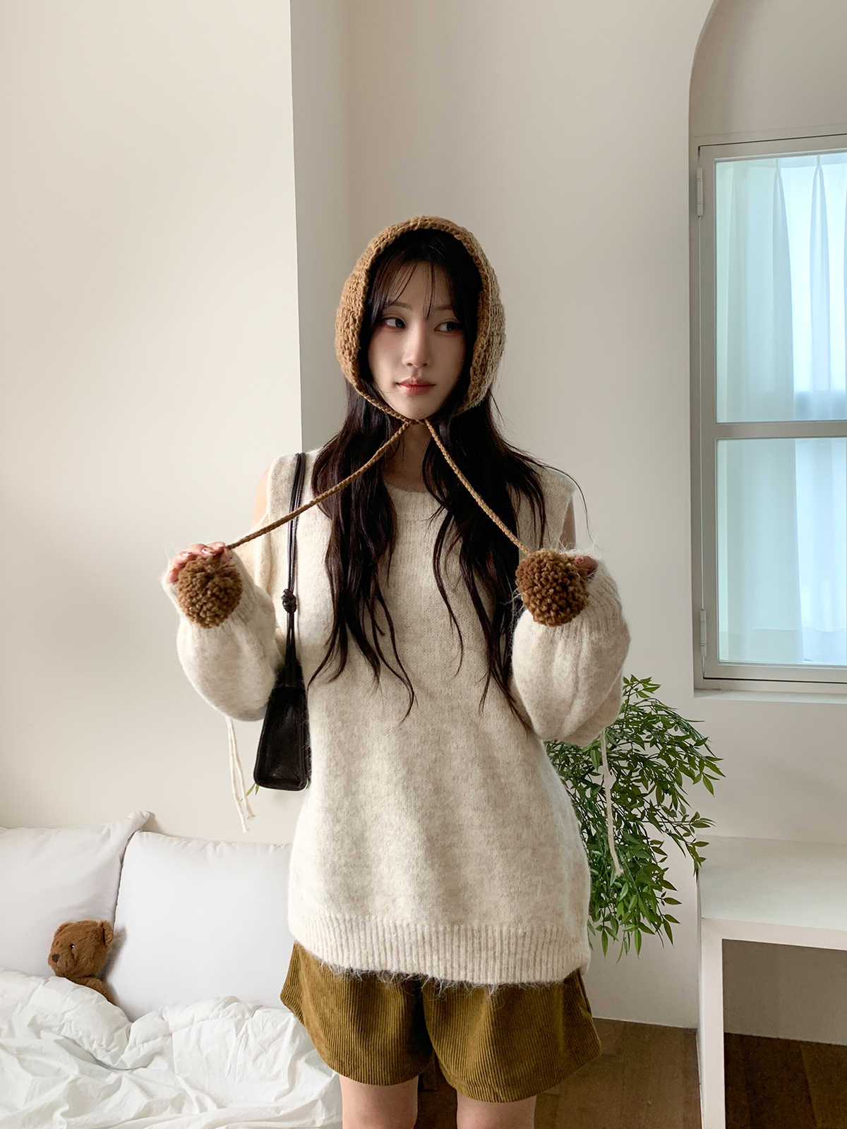 루즈한 핏이 포근한 무드를 주는 어깨 트임 니트