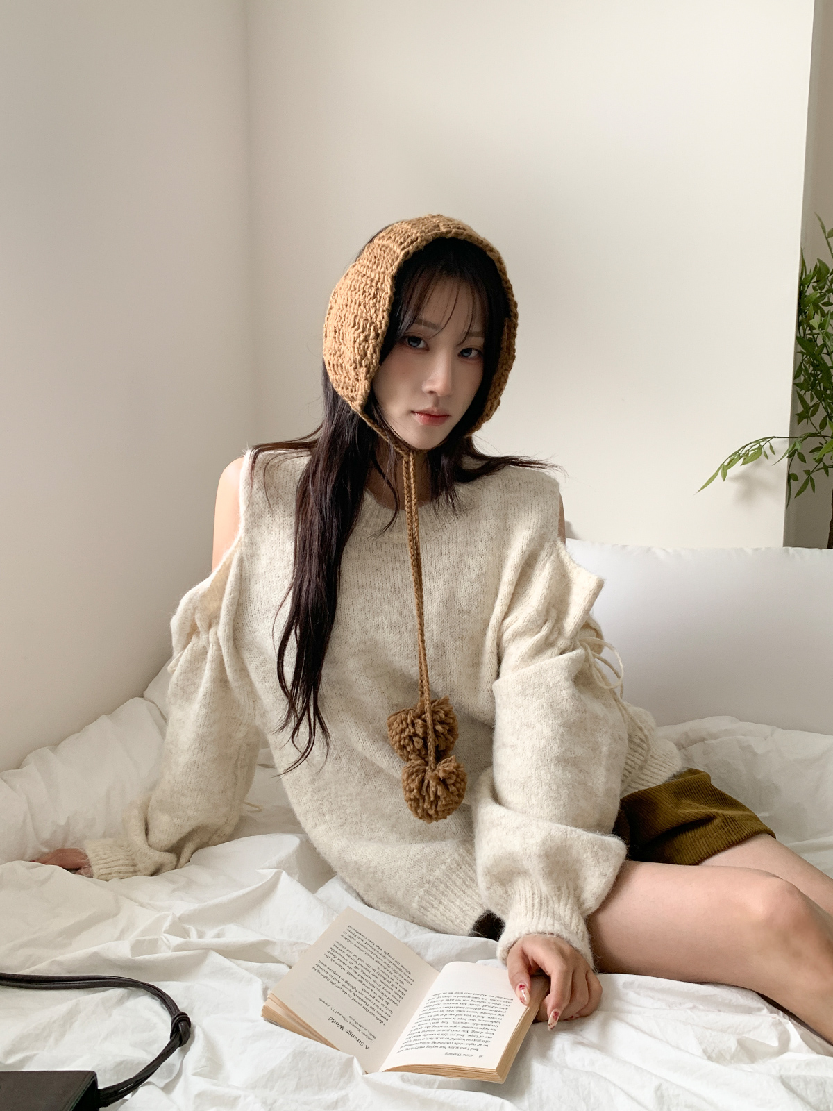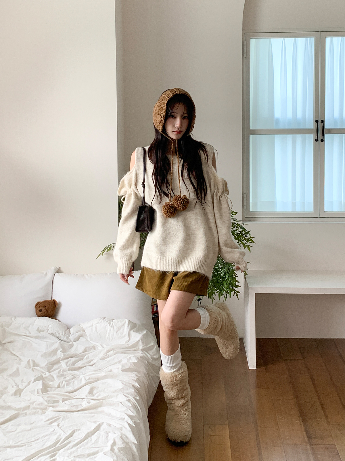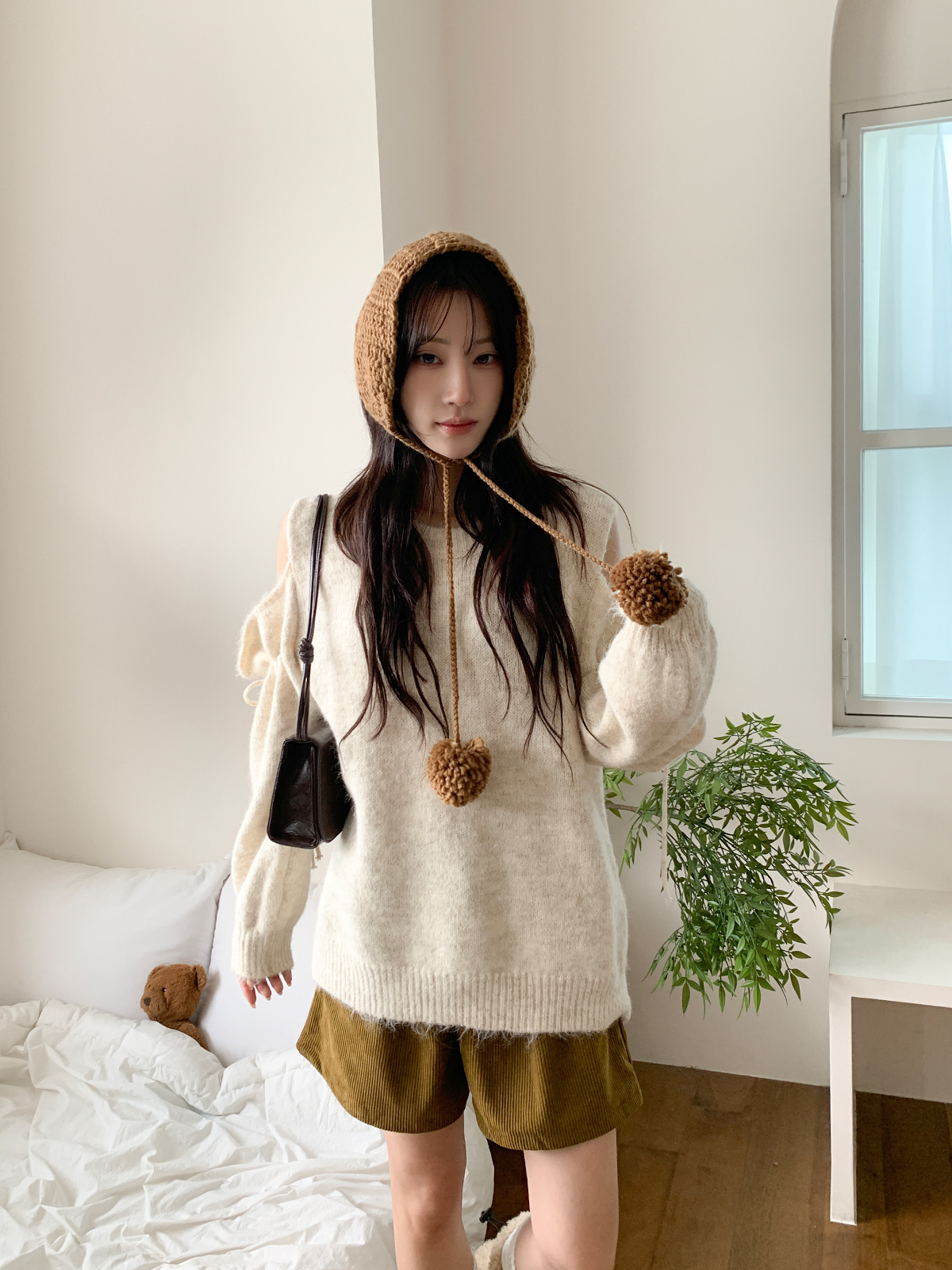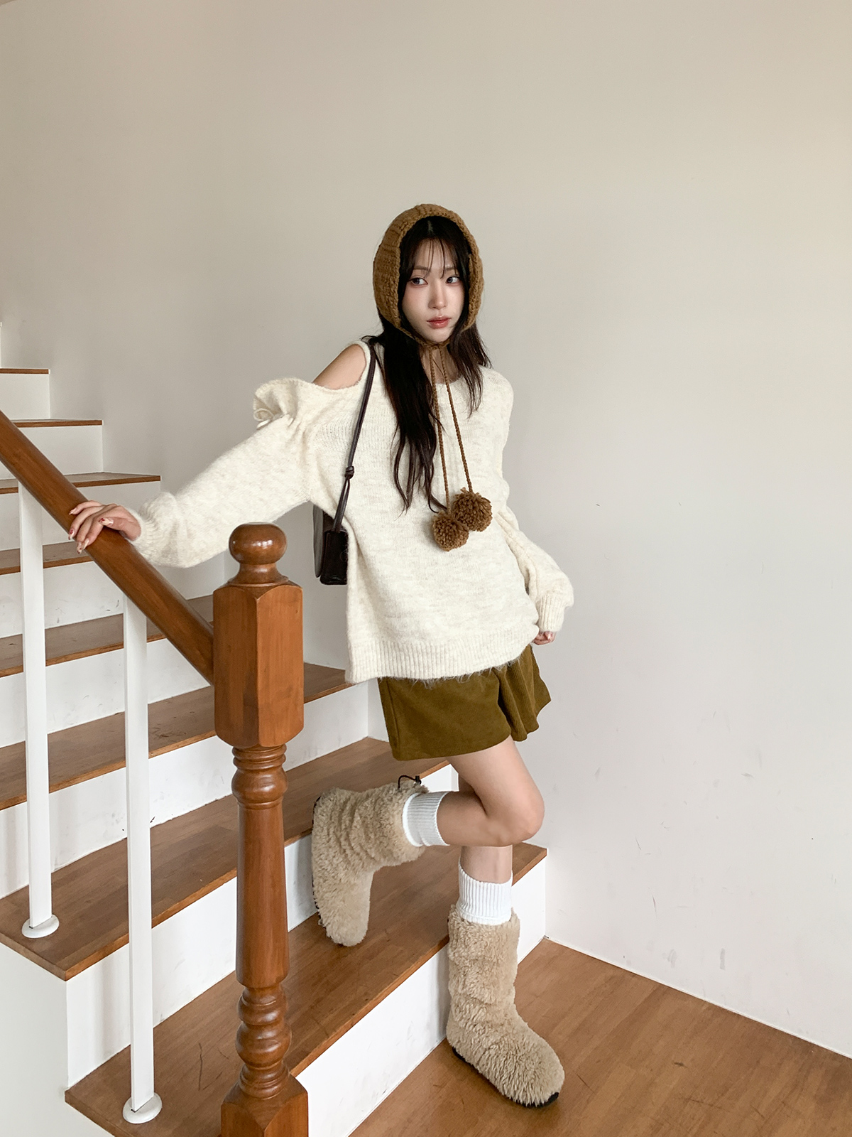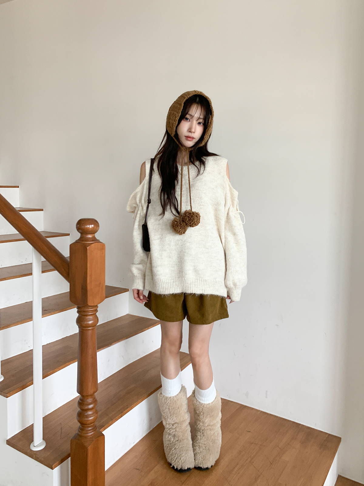 루즈한 핏이 포근한 무드를 주는 어깨 트임 니트