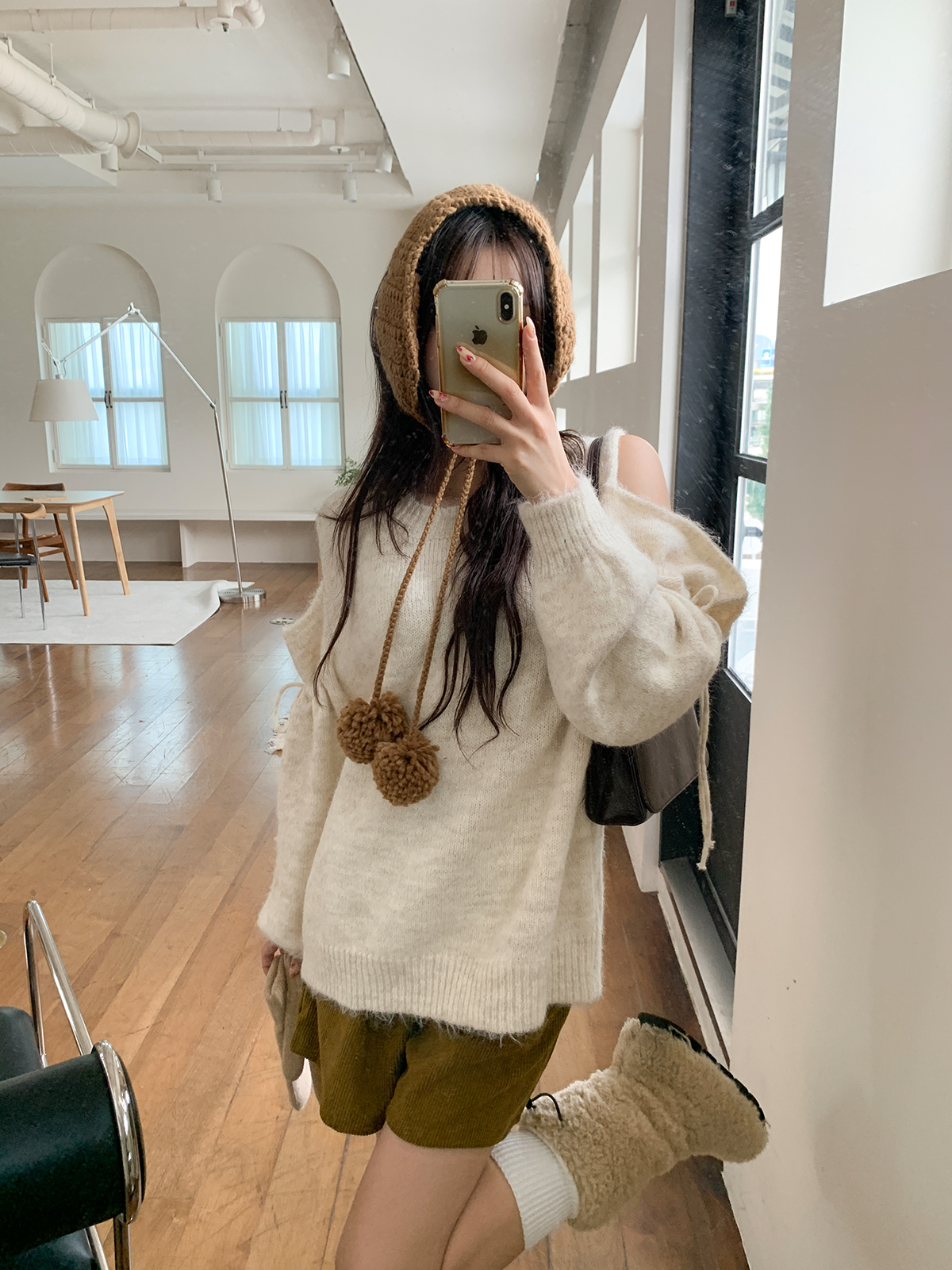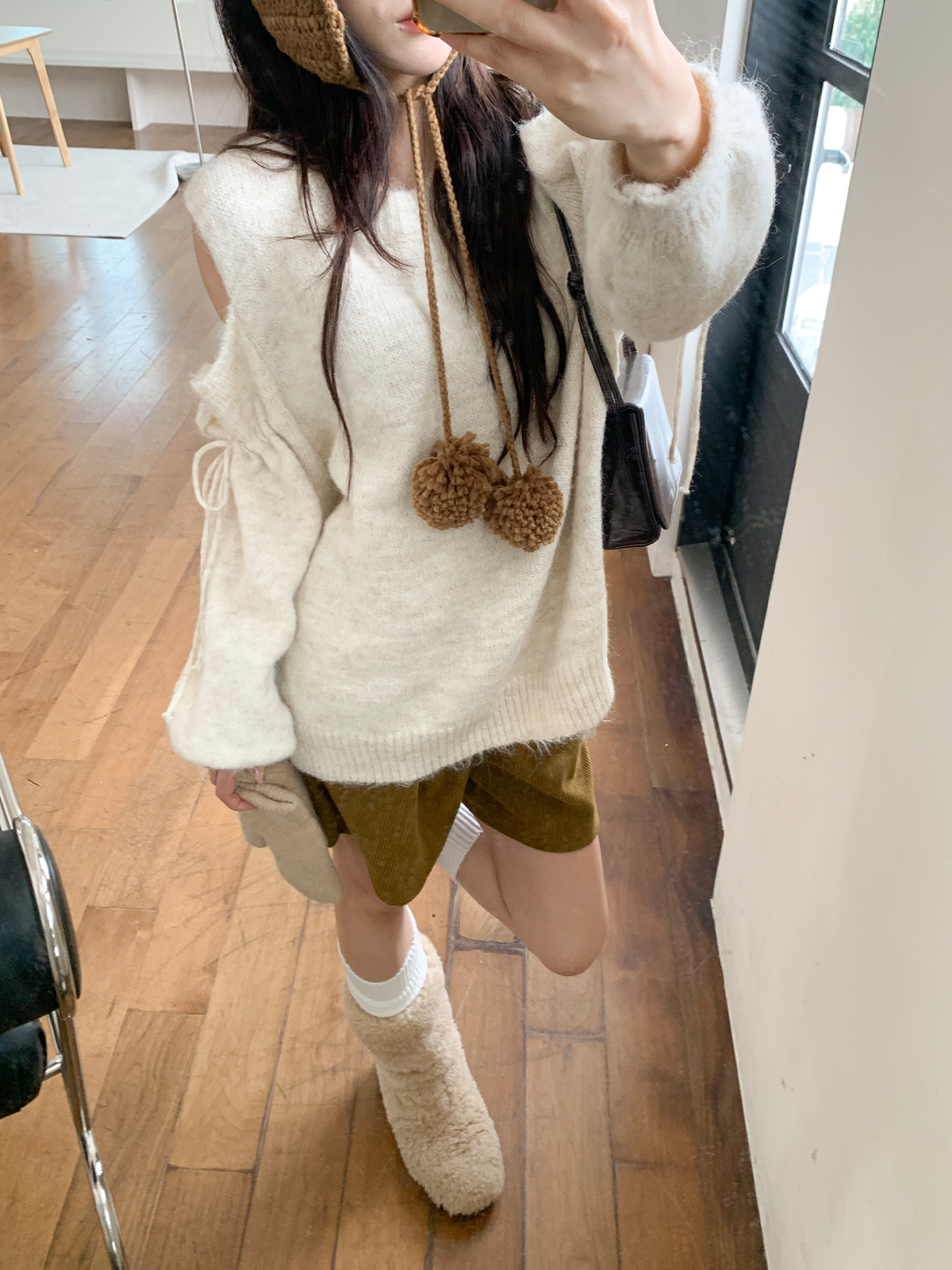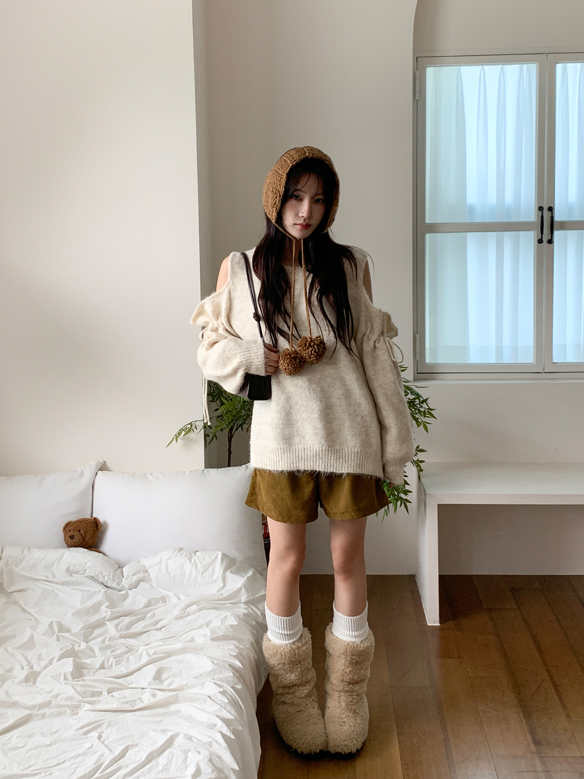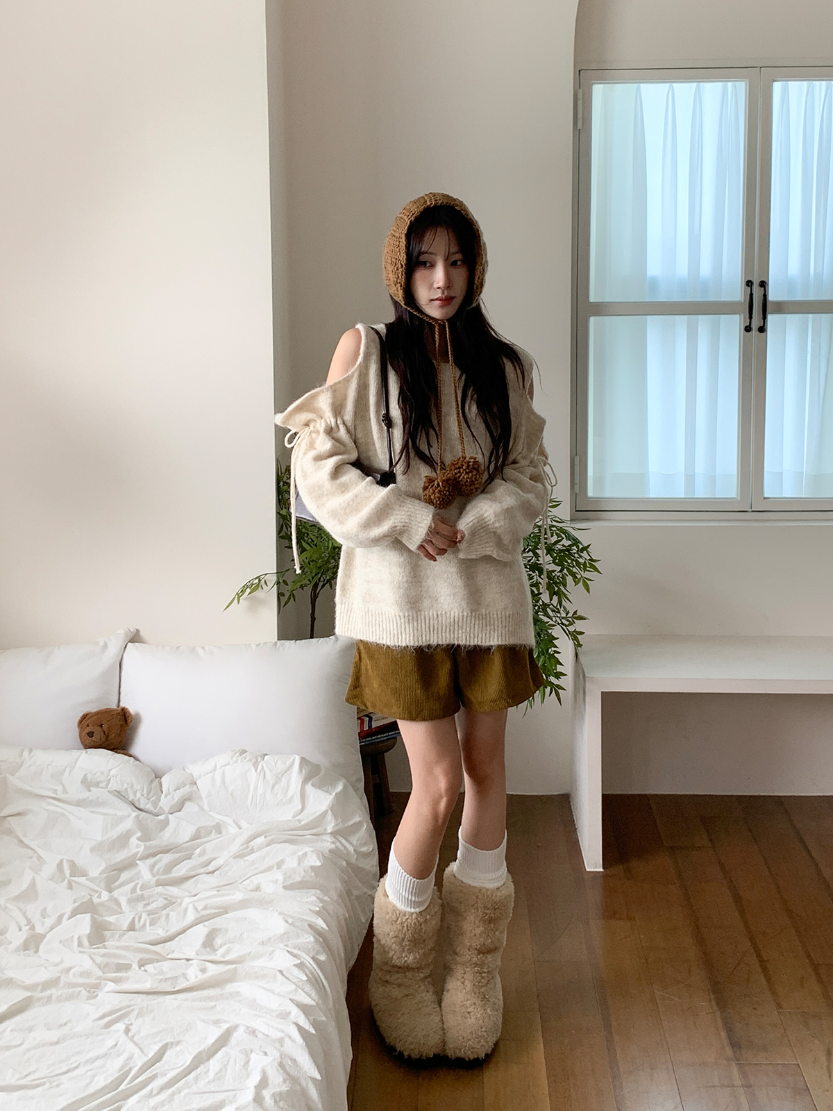 루즈한 핏이 포근한 무드를 주는 어깨 트임 니트