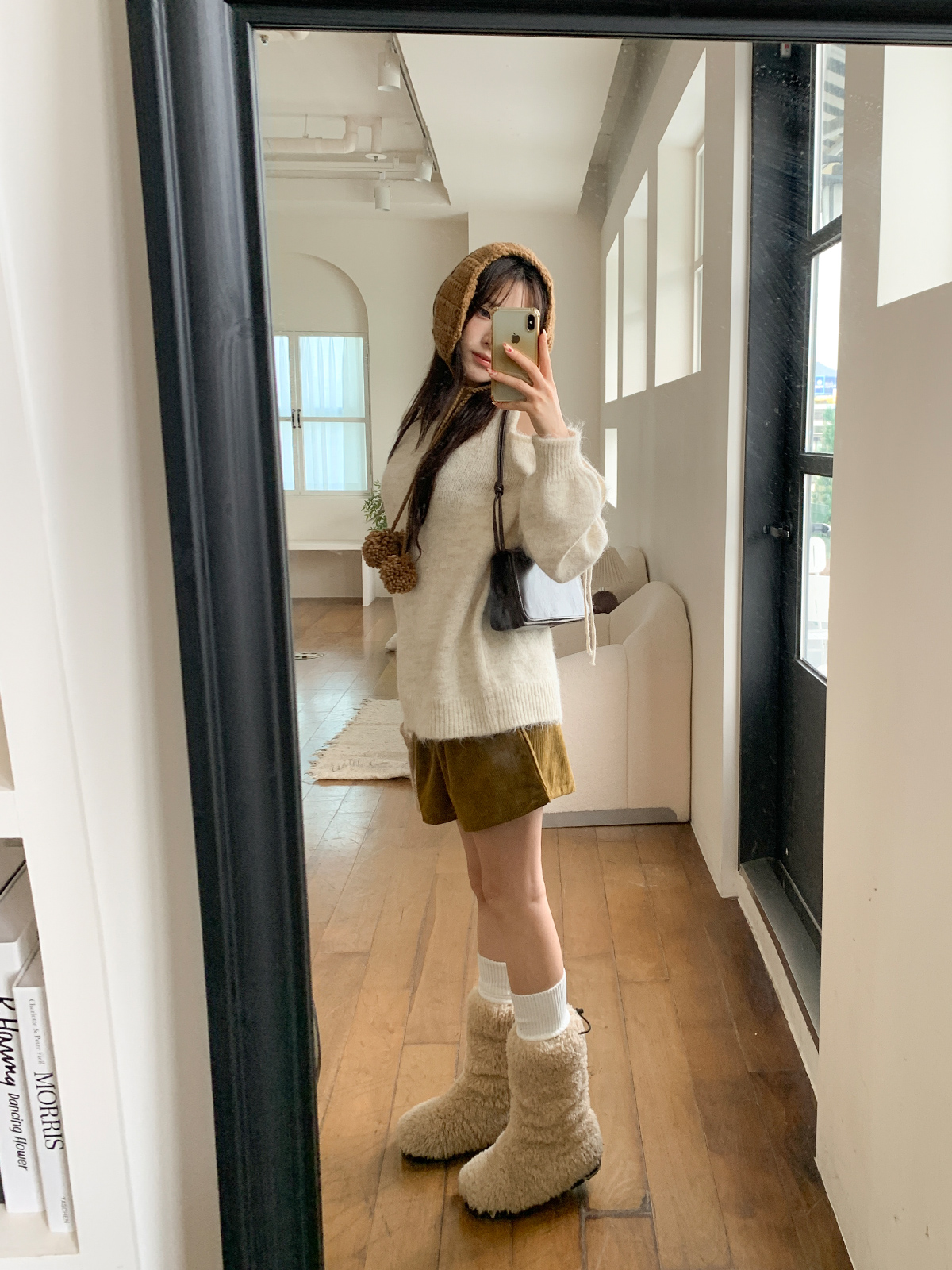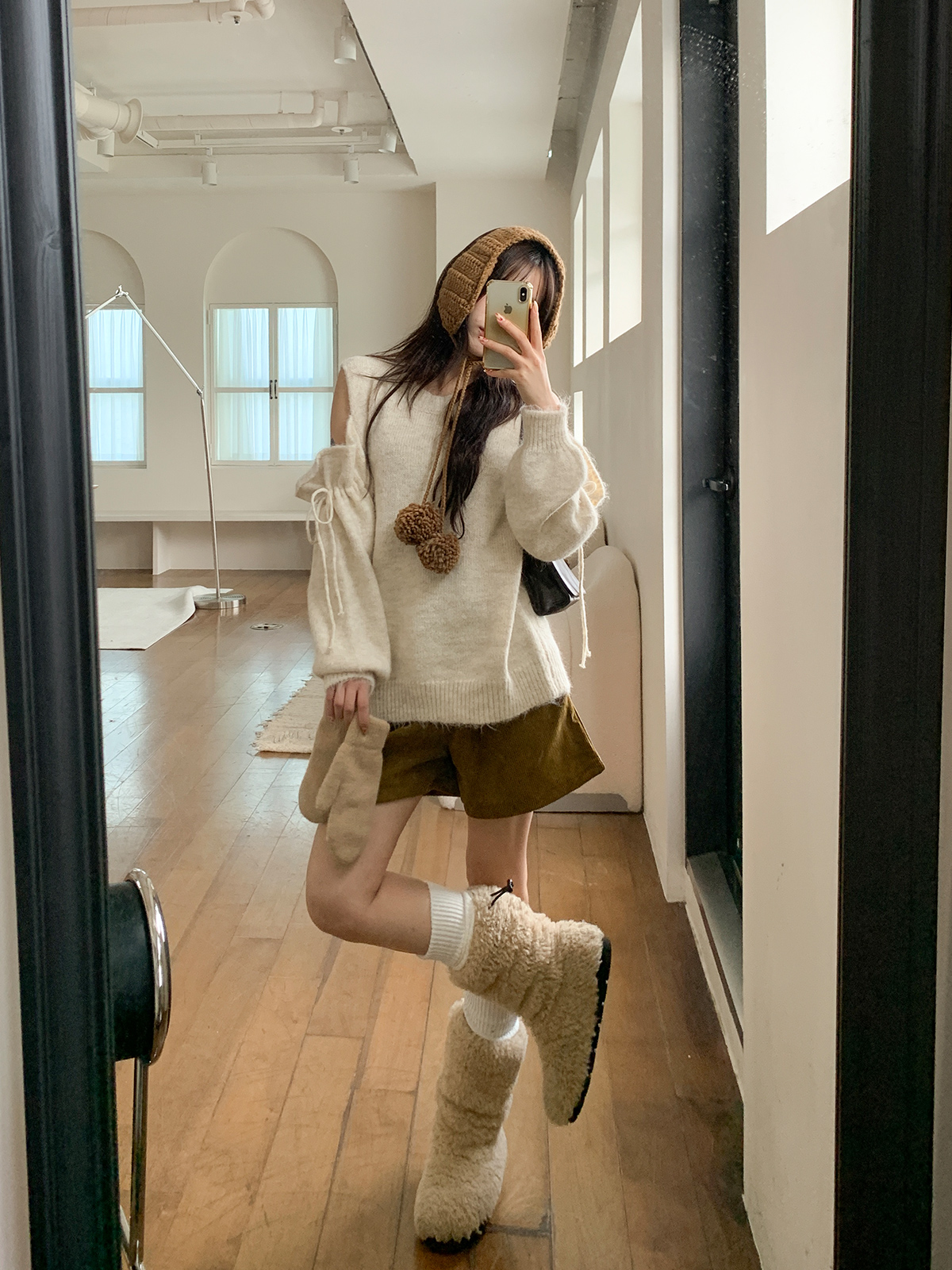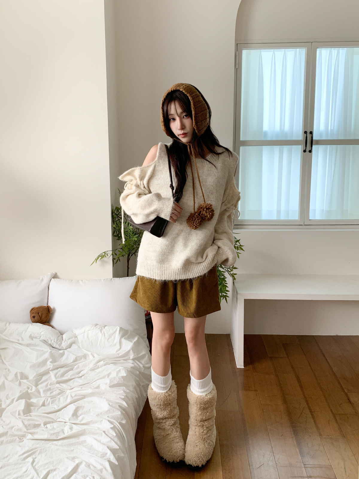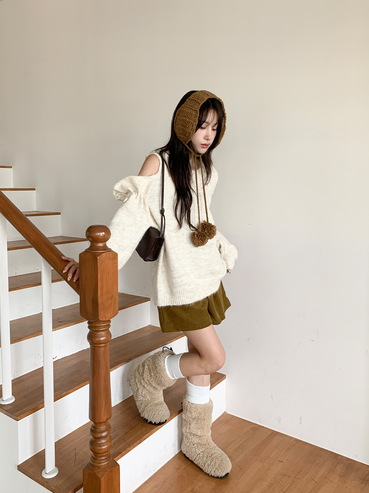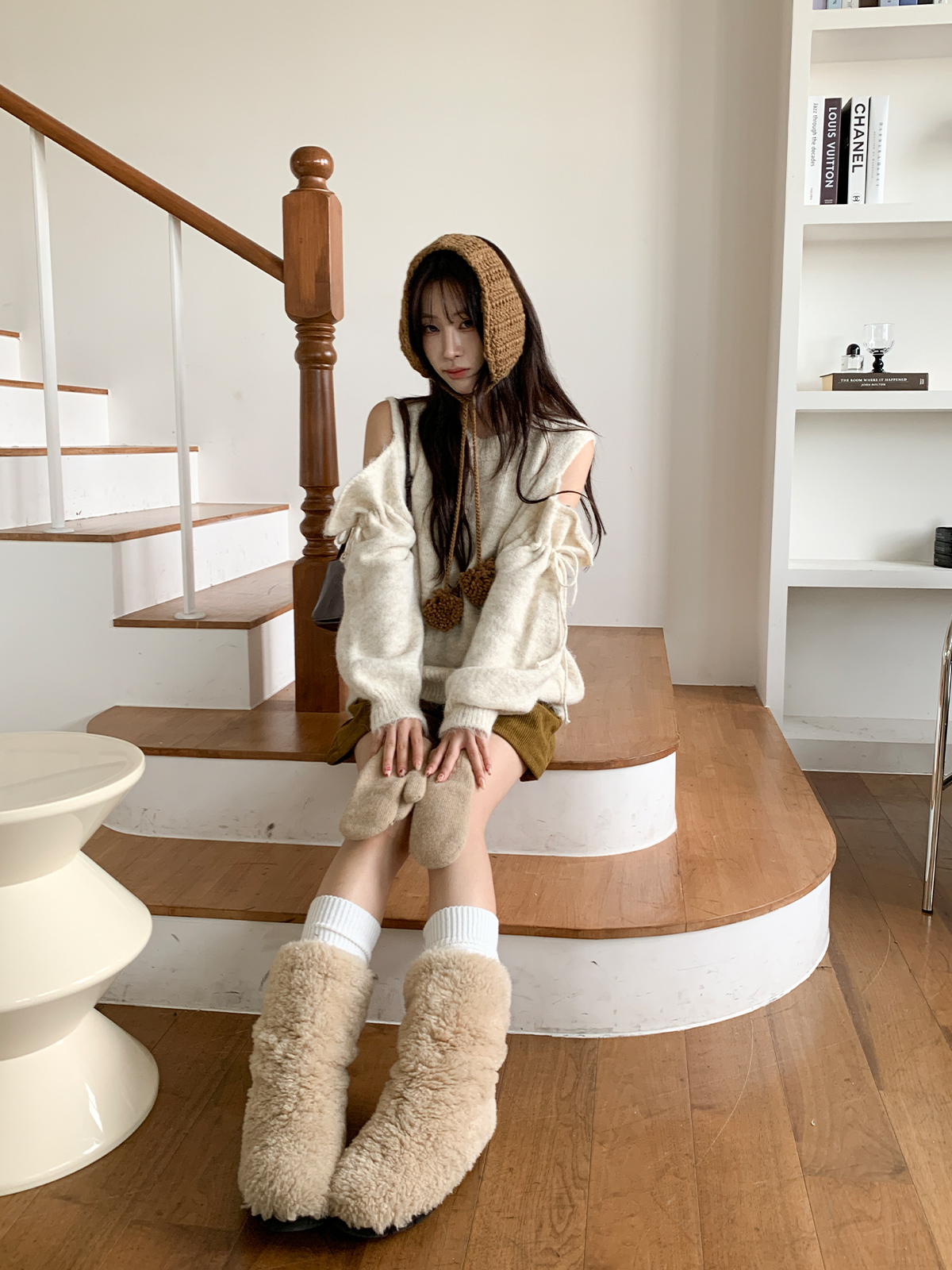 루즈한 핏이 포근한 무드를 주는 어깨 트임 니트