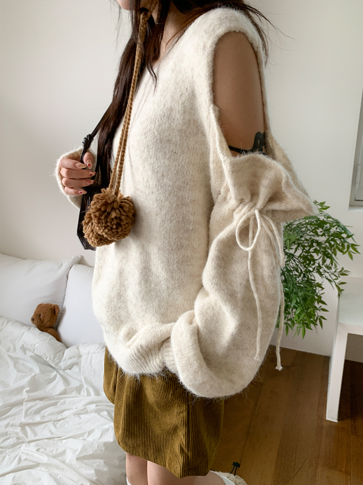 #니트#라운드넥니트#여성니트#데일리니트#니트코디#데일리코디#페미닌#러블리#캐쥬얼#데일리#가을#가을옷#가을신상#루즈핏니트#어깨트임#루즈핏#유니크#꾸안꾸#리본니트